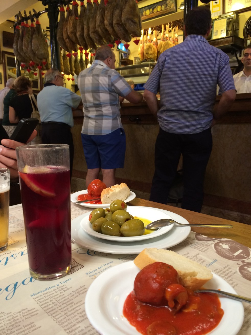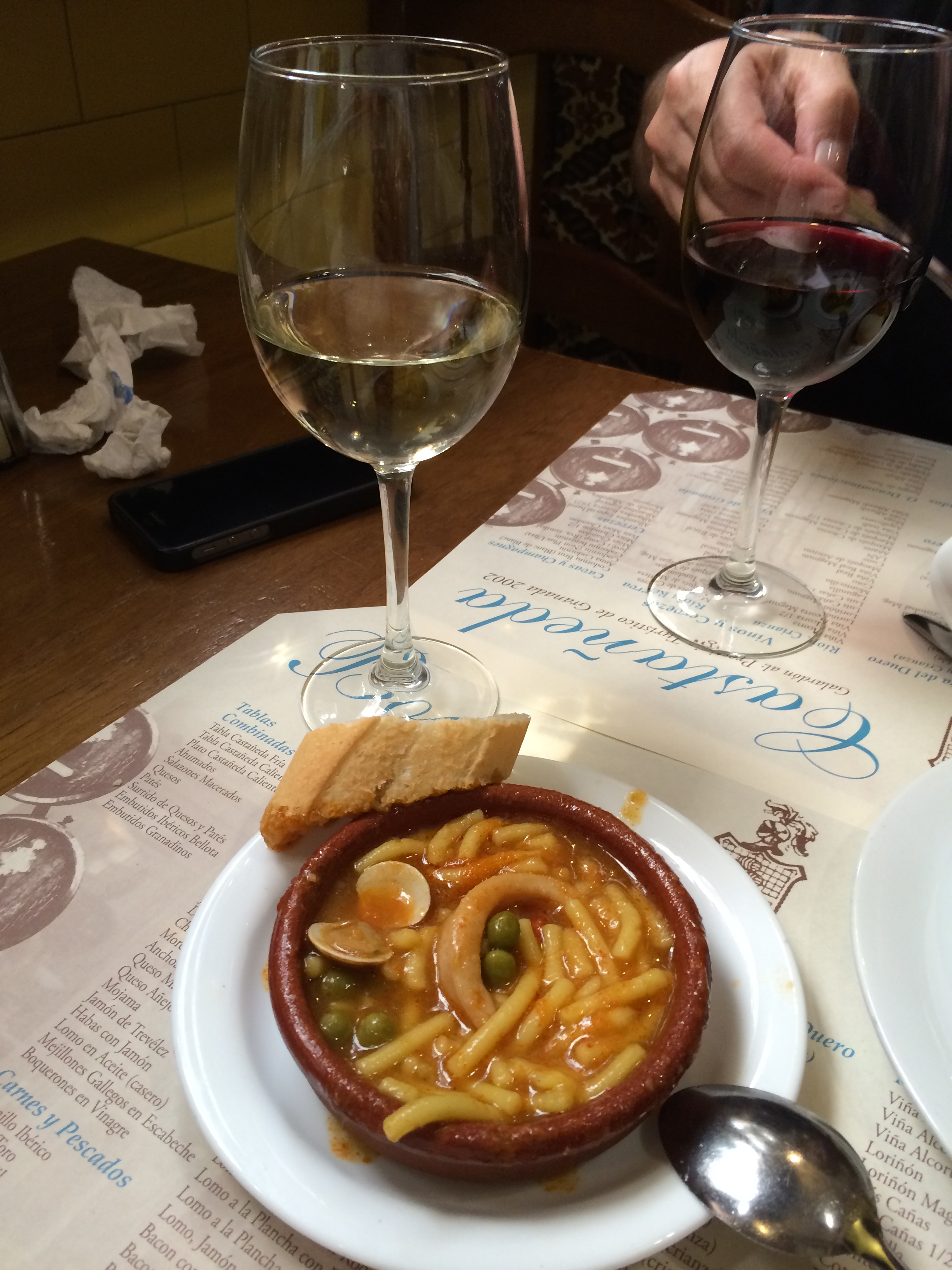 E no Castañedas as tapas são enormes e maravilhosas e o vinho da casa ótimo. A cada taça recebíamos: azeitonas, embutidos, paella sevillana (de frutos do mar), paella com macarrão (muito comum por lá, usam o macarrão ao invés do arroz – muito gostosa), linguiças diversas (tipo salame) e outros. Fomos lá três vezes de tão bom – comida e ambiente se completam!