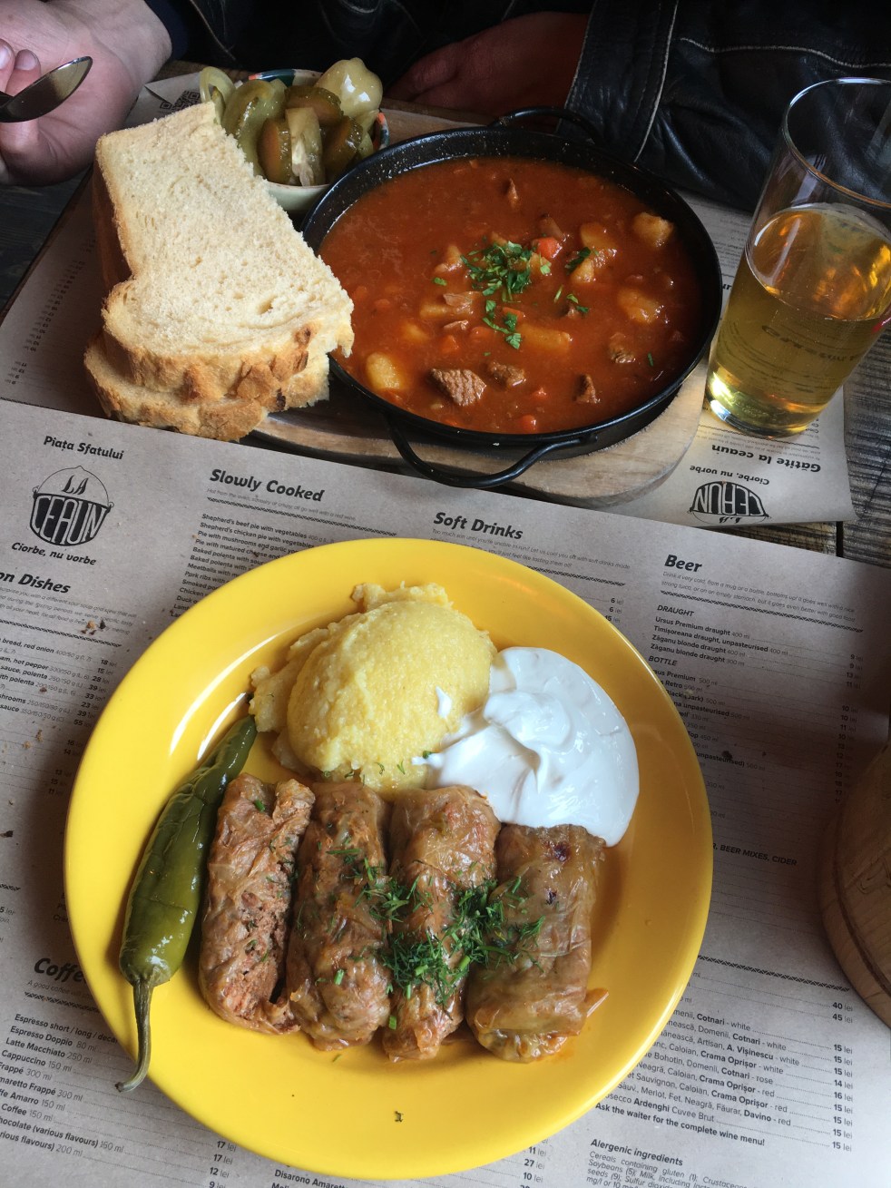 Para o prato principal eu fui de rolinhos de folha de repolho recheado com arroz e carne de porco acompanhado por polenta (bastante comum por lá) e o Rogério um goulash que estava maravilhoso. Para beber vinho branco romeno e uma cervejinha feita na Transilvânia.