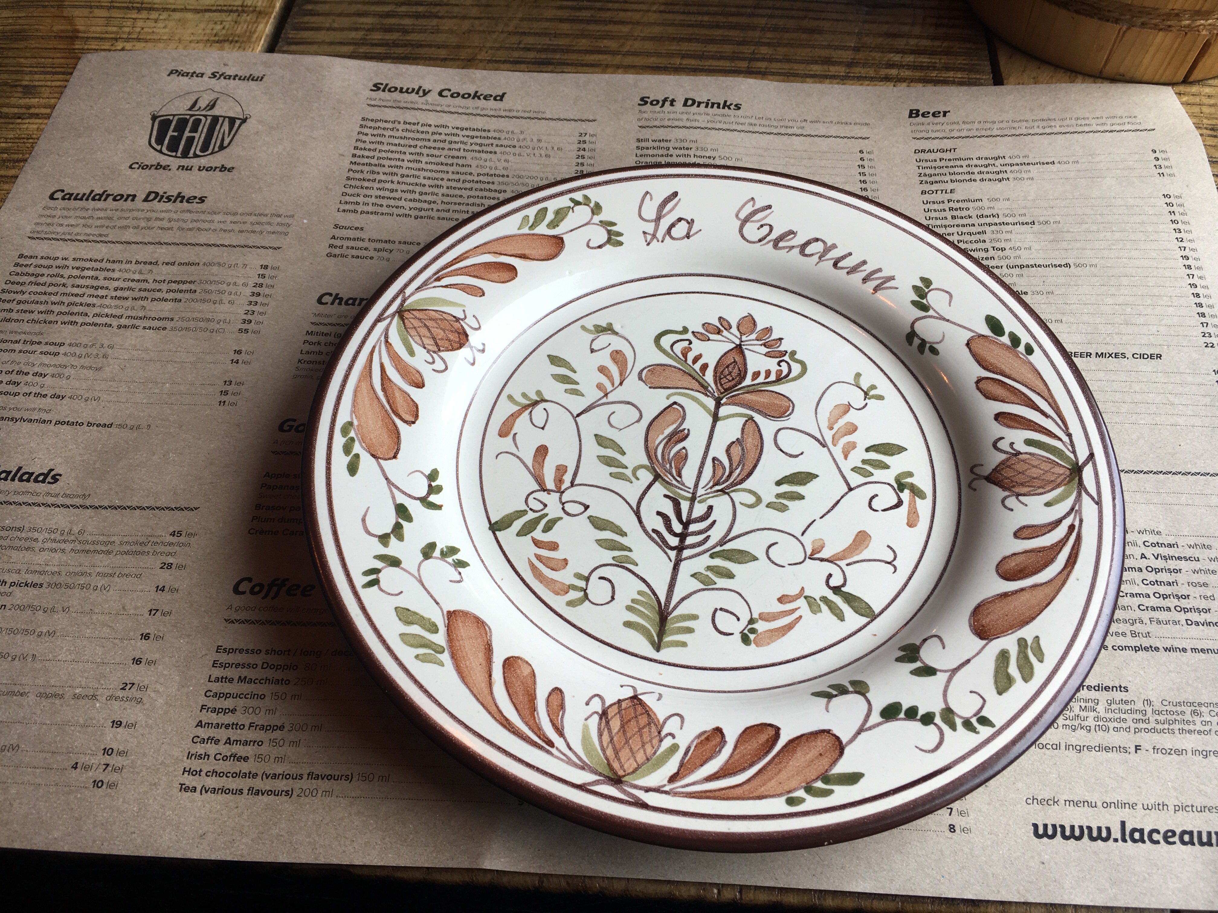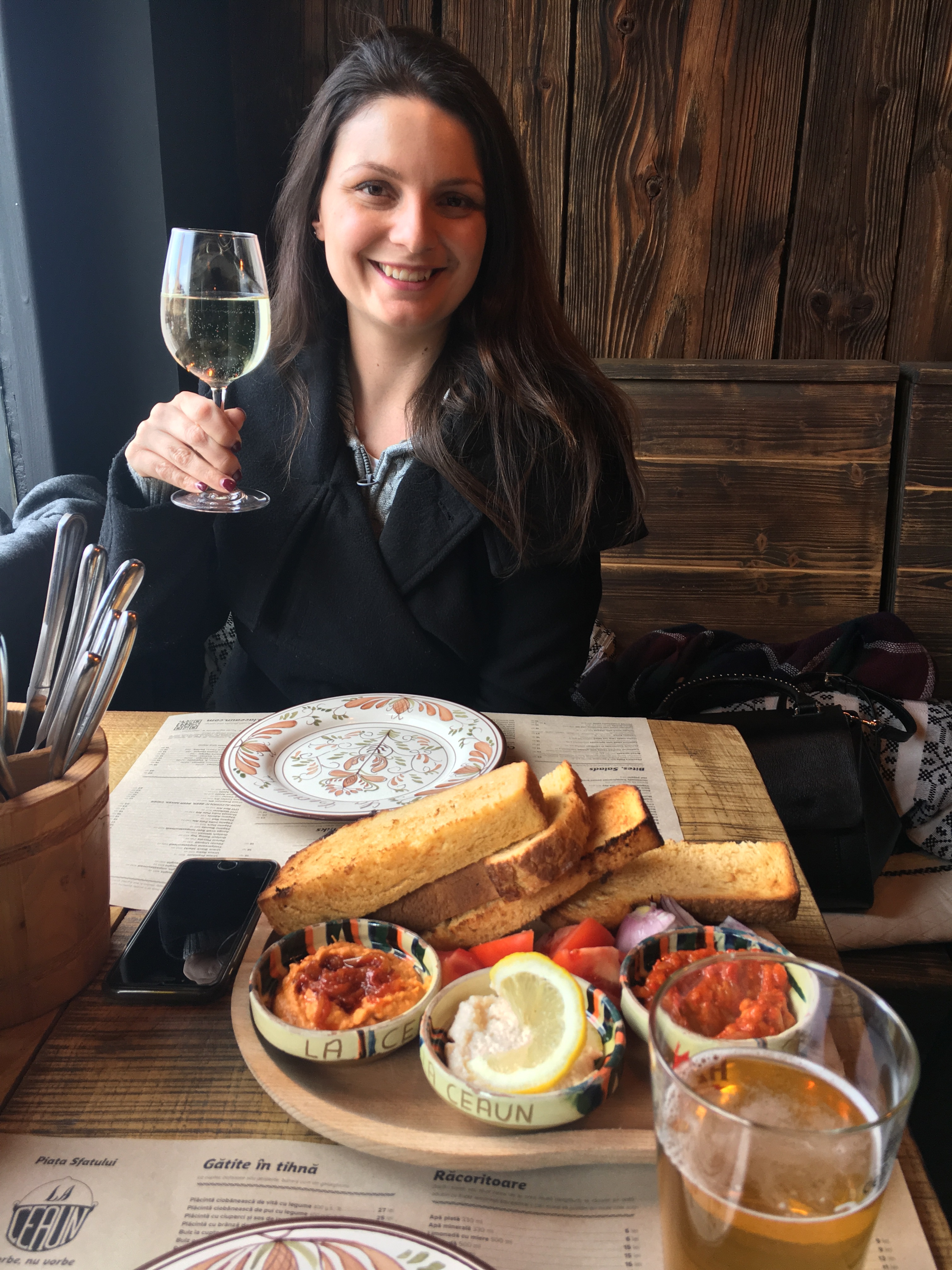Para o prato principal eu fui de rolinhos de folha de repolho recheado com arroz e carne de porco acompanhado por polenta (bastante comum por lá) e o Rogério um goulash que estava maravilhoso. Para beber vinho branco romeno e uma cervejinha feita na Transilvânia.