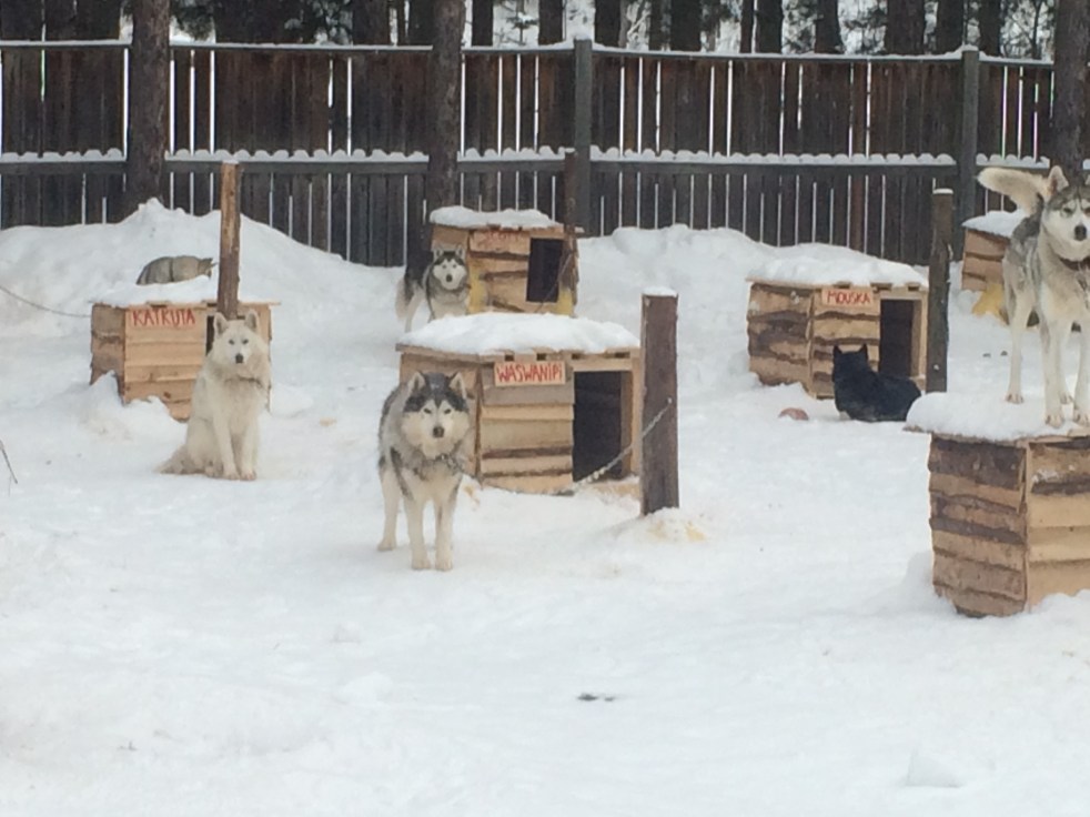 O instrutor nos levou no canil, cheio de huskies siberianos de todas as cores e idades, um mais lindo que o outro. Também há alguns vira latas no meio porque são muito fortes e ajudam a puxar o trenó. Muitos desses cães estavam abandonados e foram resgatados e tratados.