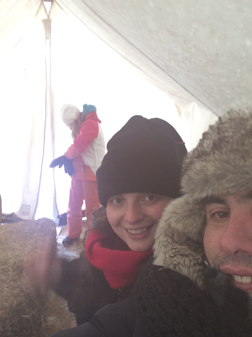 O passeio dura duas horas e quinze minutos: uma hora de ida passeando pelo bosque nevado, quinze minutos de descanso em uma cabana aquecida onde tomamos chocolate quente e comemos biscoitos de maple e mais uma hora de volta.