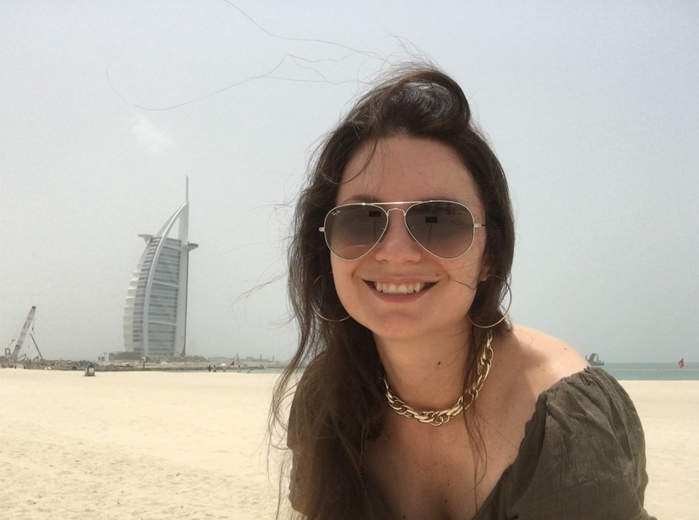 Nossa próxima parada foi na praia Umm Suqeim Third (é só colocar esse destino no Waze) para ver e tirar algumas fotos do Burj Al Arab. Para entrar no hotel, que é o único 7 estrelas do mundo, é preciso estar hospedado ou ir a algum dos seus restaurantes. Nós reservamos para essa mesma noite para tomar drinks no Skyview bar, o bar panorâmico do hotel, então o vimos de dia e de noite.