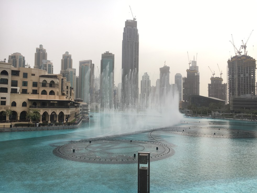 Na saída, à direita, ficam as Fontes de Dubai, um espetáculo de águas, luzes e música. No verão começa ás 18:00 e tem um novo a cada 30 minutos.