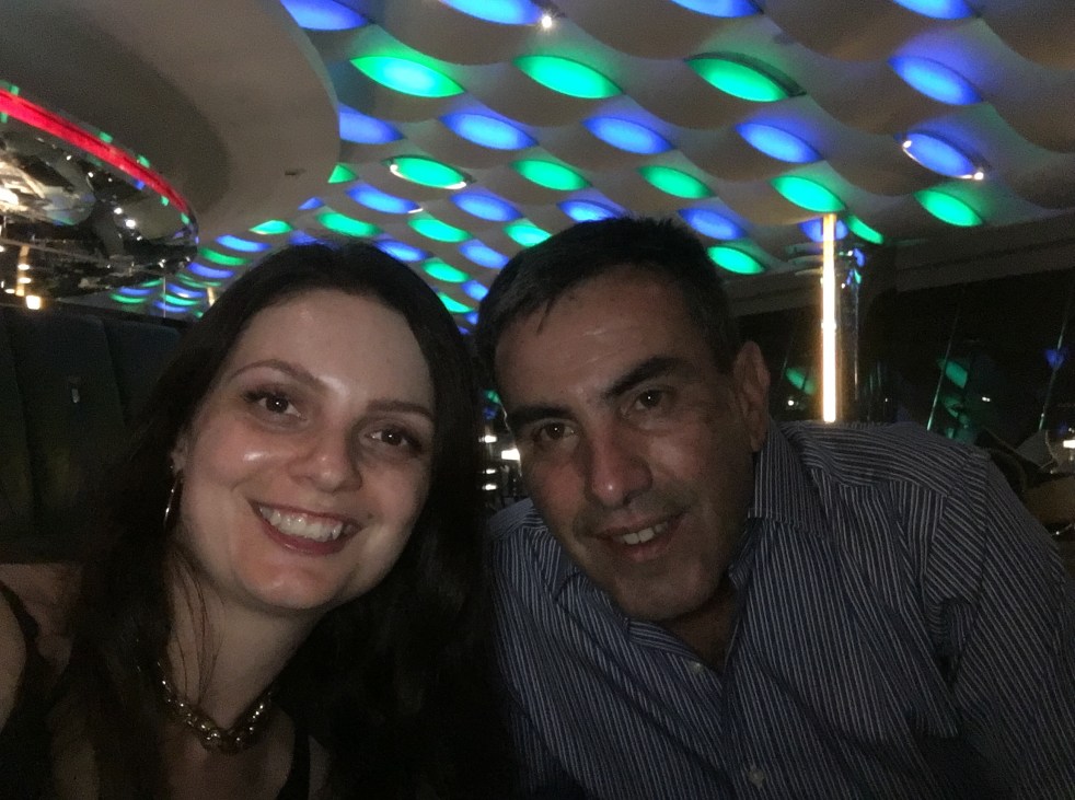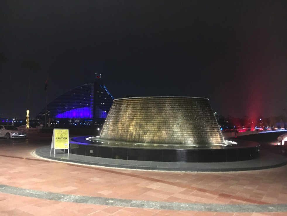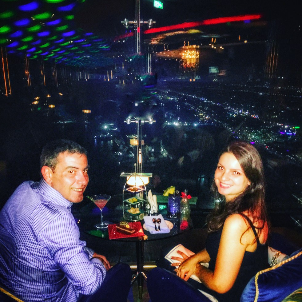Quando estávamos satisfeitos pegamos o elevador e entramos no restaurante. A hostess foi super simpática e até arranhou umas palavrinhas em português. Nos posicionaram em uma mesinha na janela que tinha uma vista privilegiada para a praia de Jumeirah. Mesmo de noite, a cidade é toda iluminada e dá para ver muita coisa sim! Eu havia lido alguns relatos de que o reflexo do vidro não deixava ver nada, mas não concordo e recomendo ir sim!