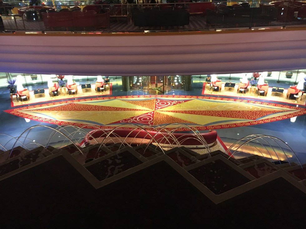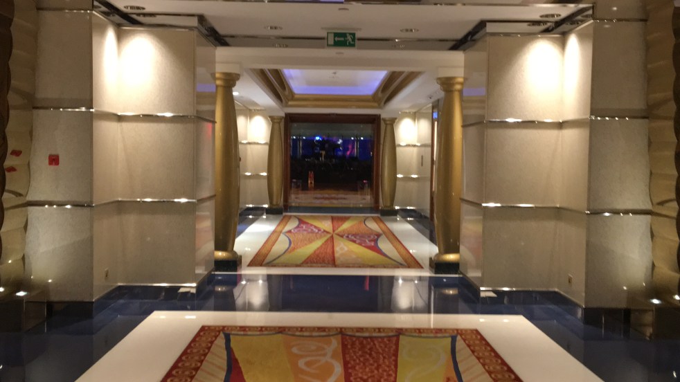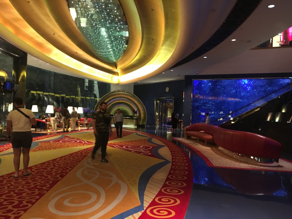 O hall de entrada tem cores fortes e brilhantes, muito ouro e um conjunto de fontes dançantes com luzes e dois imensos aquários. É realmente impactante e vale muito a pena visitar.