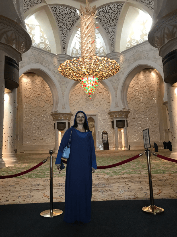 Logo na entrada, quando confirmam seu cadastro, as mulheres devem entrar em uma salinha onde te dao uma capa para colocar em cima da roupa. Em seguida você sobre em uma carrinho elétrico que te leva até a entrada da mesquita.