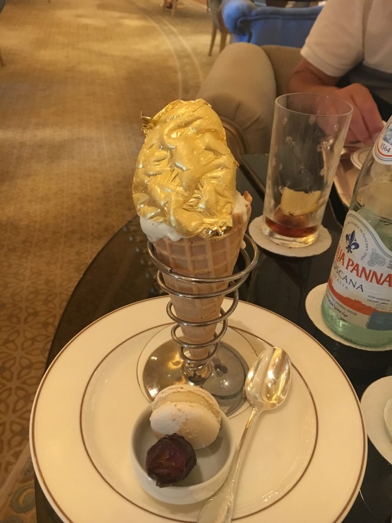 Nós fizemos uma reserva para almoçar no Le Cafe, um dos restaurantes dentro do Emirates Palace e que tem um clima mais informal e serve os famosos pratos com ouro. Pedimos o carro chef da casa que é o hamburguer de camelo que vem acompanhado de batata doce frita com ouro e um hamburguer de Wagyu.