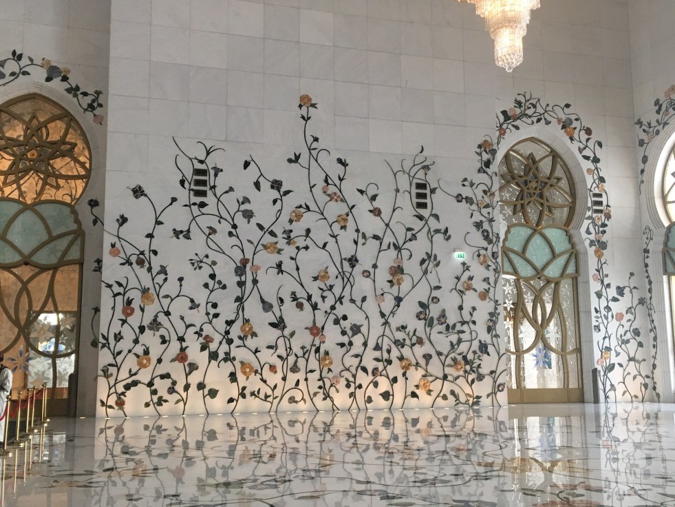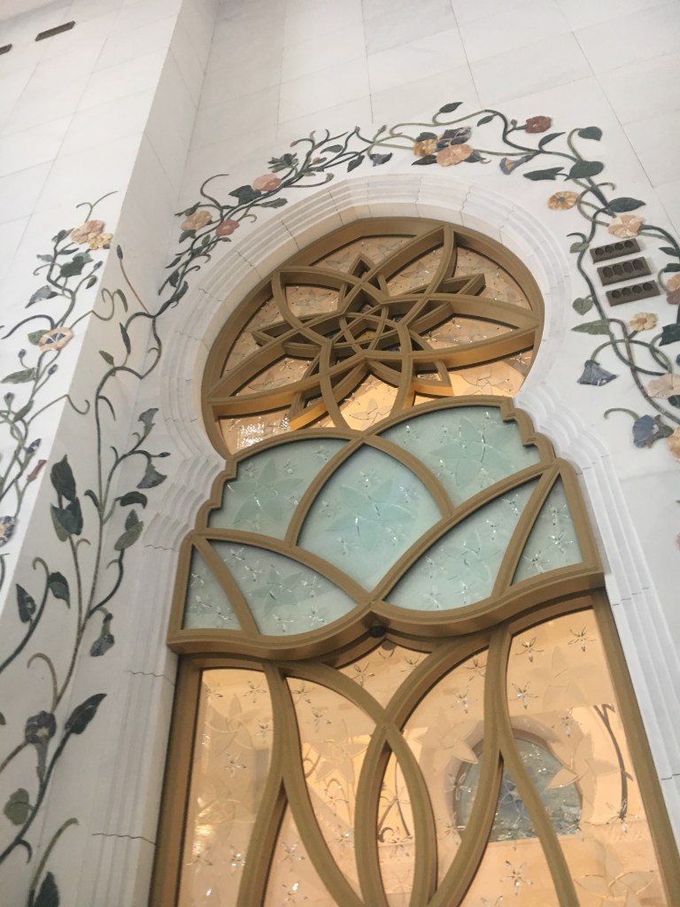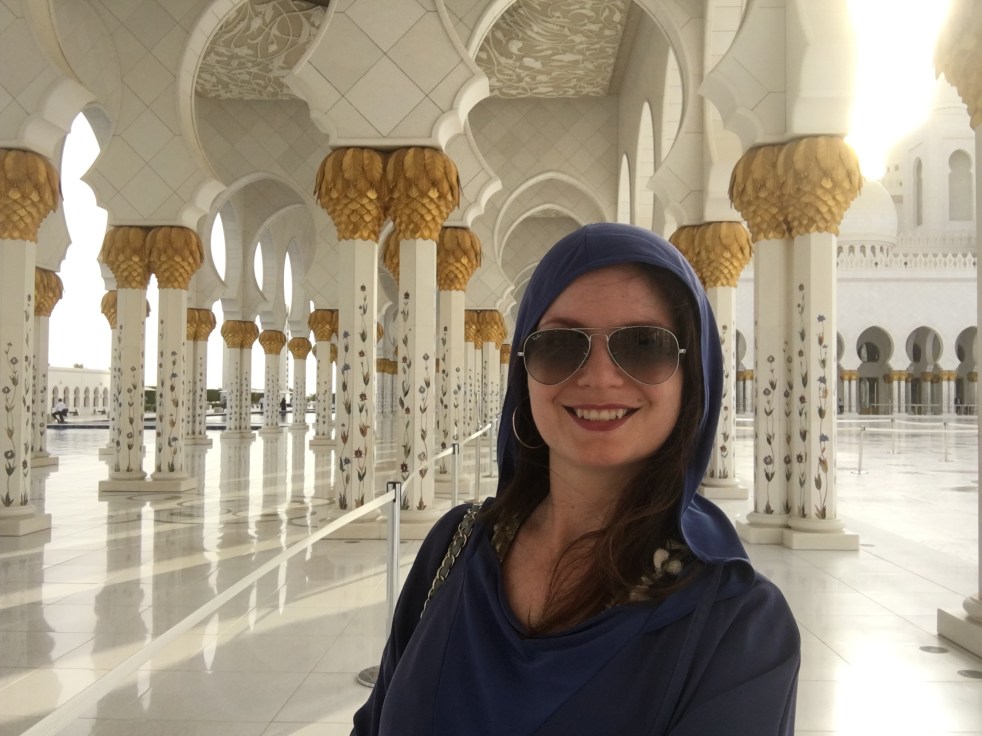 Nossa próxima parada foi na mesquita de Sheik Zayed. A visita é gratuita só é preciso fazer um cadastro online no próprio site da mesquita. O estacionamento é grátis.