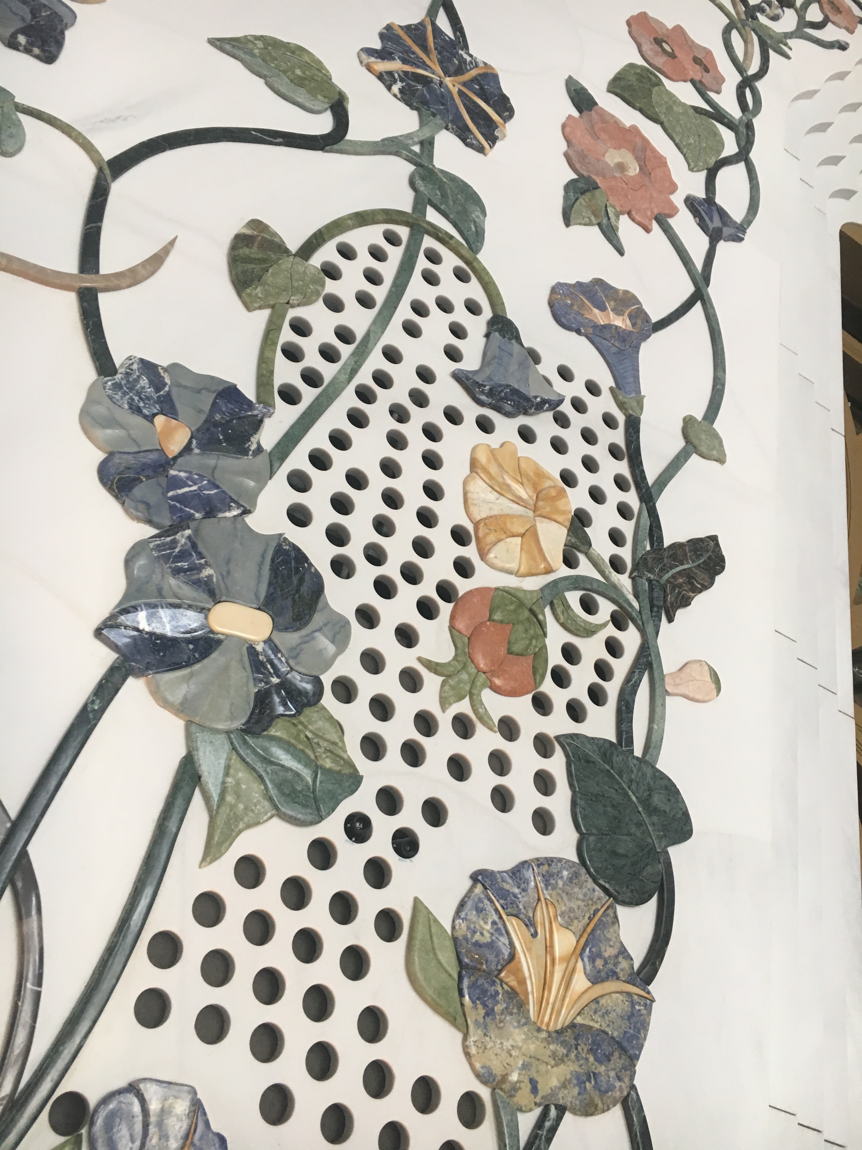 Mas o que mais impressiona é a decoraçao interior, inspirada na arte musulmana de Marrocos, Argélia e Paquiatao, feita toda em mármore incrustrado de pedras preciosas como lápis lazulis, ametista, ônis entre outras.