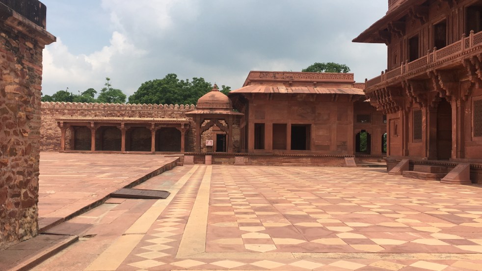 Panch MahalBem em frente fica uma espécie de tabuleiro de xadrez que o imperador costumava jogar usando suas esposas e comcubinas nuas como peças! Ele era muito conhecido também pelas festas que dava e pelos músicos que trazia.