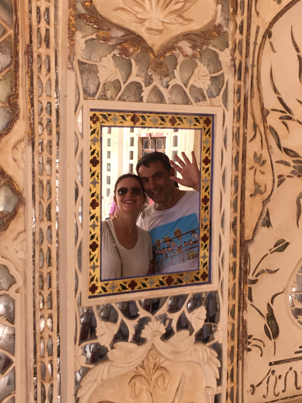 Outra sala bastante interessante é a Sala dos Espelhos (Hawa Mahal) que na época em que o Palácio era habitado pela realeza, somente uma vela era necessária para iluminar o lugar por causa do desenho e distribuiçao dos espelhos. Nosso guia contou que Shakira se apresentou para a família real e que por conta dos espelhos todos os conviados podiam vê-la de onde estavam.