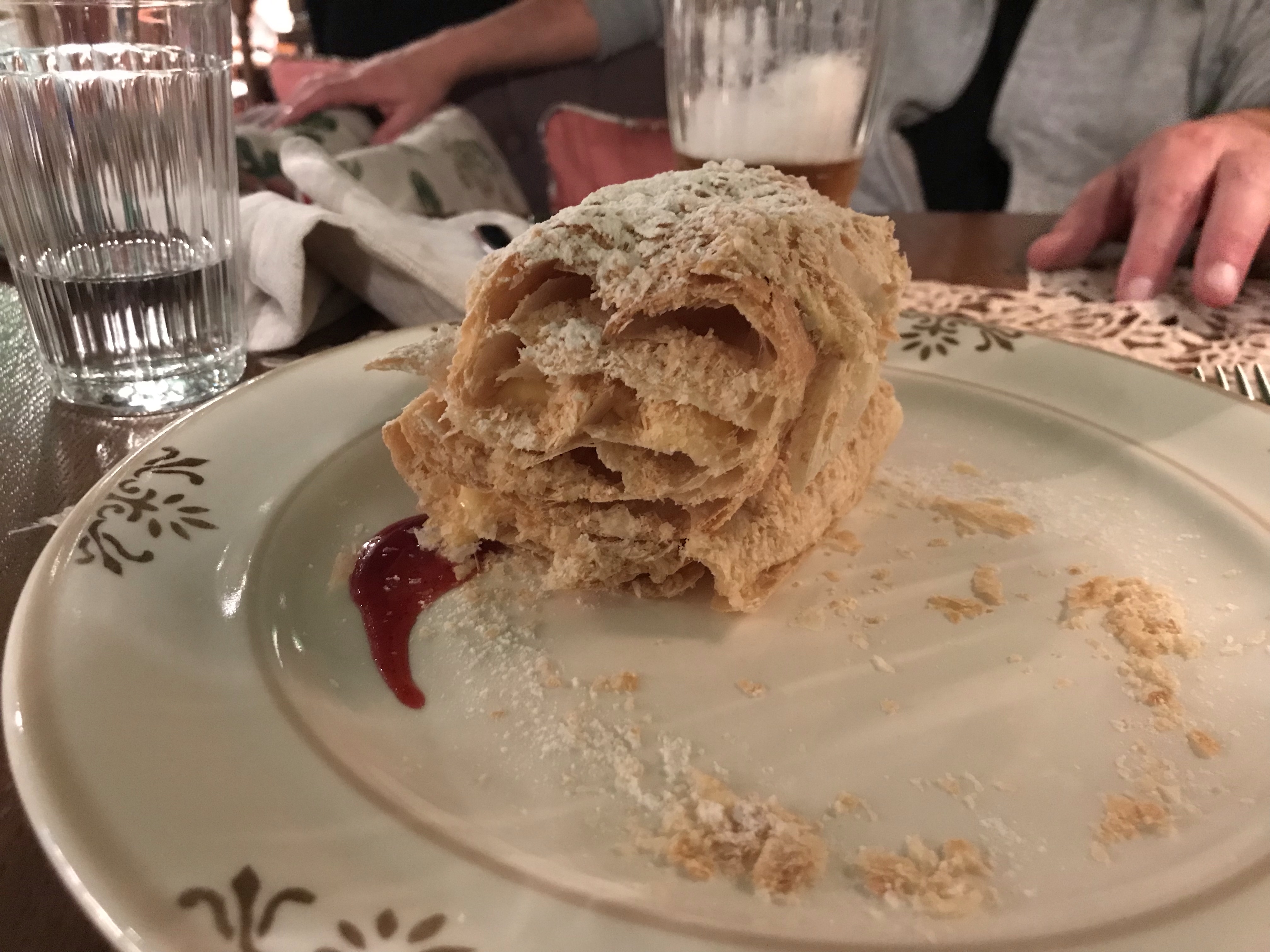 É o famoso mil folhas russo. É muit crocante, mas ao mesmo tempo dissolve na boca. Entre uma “folha” e outra o recheio é de Smetana e pêssego em calda.