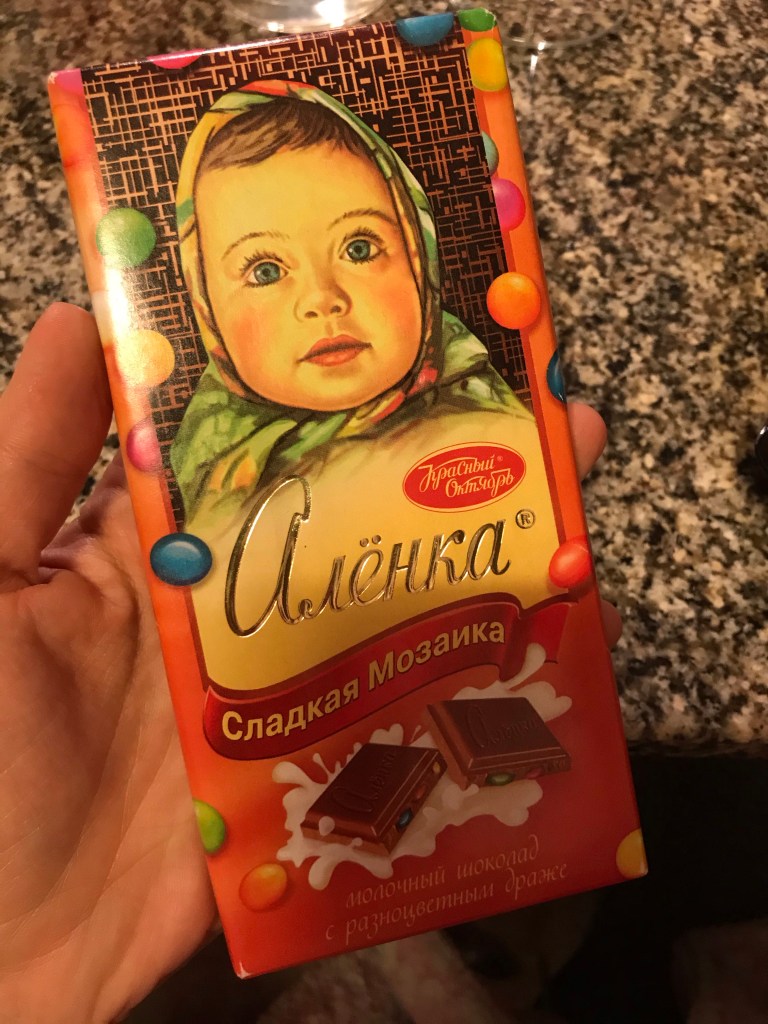 Agora o chocolatinho mais famoso da Rússia da marca Alenka. Ele é produzido desde 1965 primeiramente como parte de um programa de alimentação socialista, como um chocolate barato produzido em larga escala. Para escolher a bebezinha da capa foi realizado um concurso e dizem que a ganhadora foi Svetlana Allilueva, a filha de Stalin.
