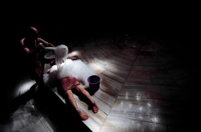 Calcinha posta, voltamos à sauna. O processo todo, do pacote que eu comprei, dura uns 40/45 minutos: 15 minutos de sauna + exfoliação + 20 minutos de massagem com espuma + banho. Há vários pacotes de banho turco + massagem e eu escolhi o Cagaloglu Hamman que inclue massagem extra nos pés.