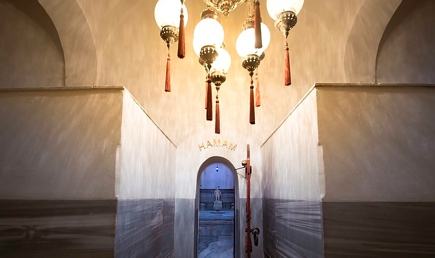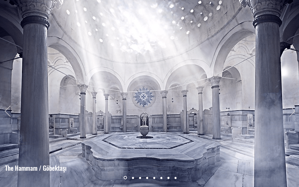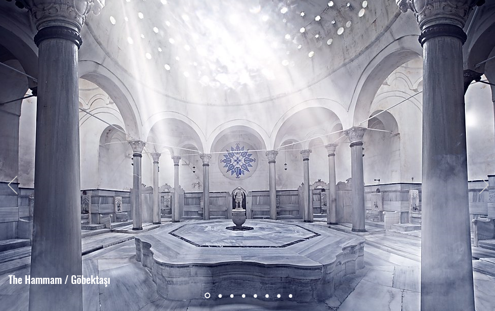 Fonte: cagalogluhamami.com.trMais uma vez, a sala do hamman é toda de mármore branco aquecido e no centro há um círculo de mármore mais alto que o nível do chão, onde se realizam as massagens de espuma. Há uma pequenas salinha ao lado desse círculo, que é a sauna a vapor e outras áreas destinadas ao banho com torneiras de água quente e fria.