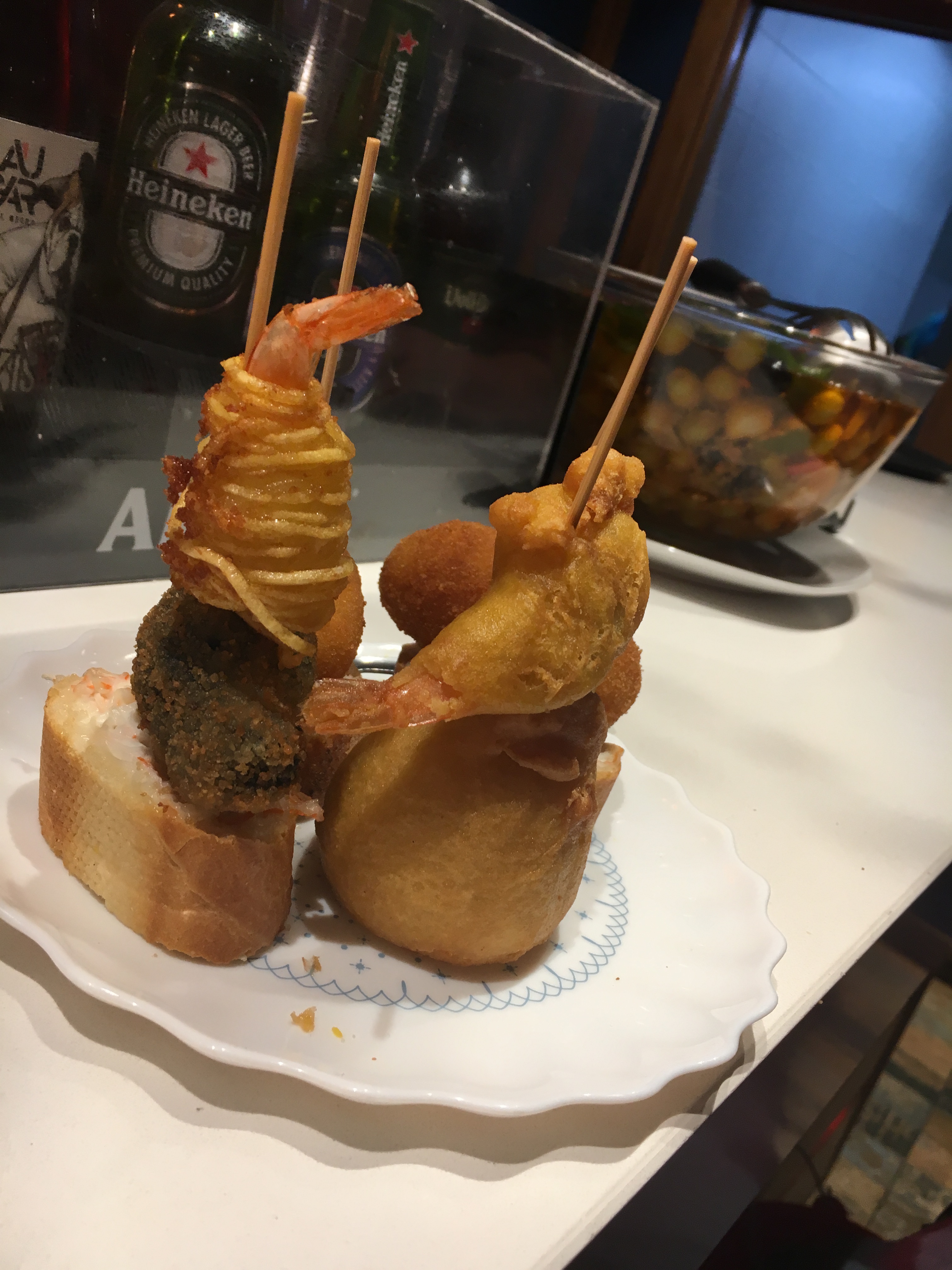 Pela Calle Bidebarrieta entramos no centro histórico com suas ruazinhas pequenas tomadas por lojinhas e restaurantes. Chegamos à Plaza Barria, uma área de bares de pintxos e por ali ficamos. Pulamos de bar em bar experimentando um pouco de cada um.