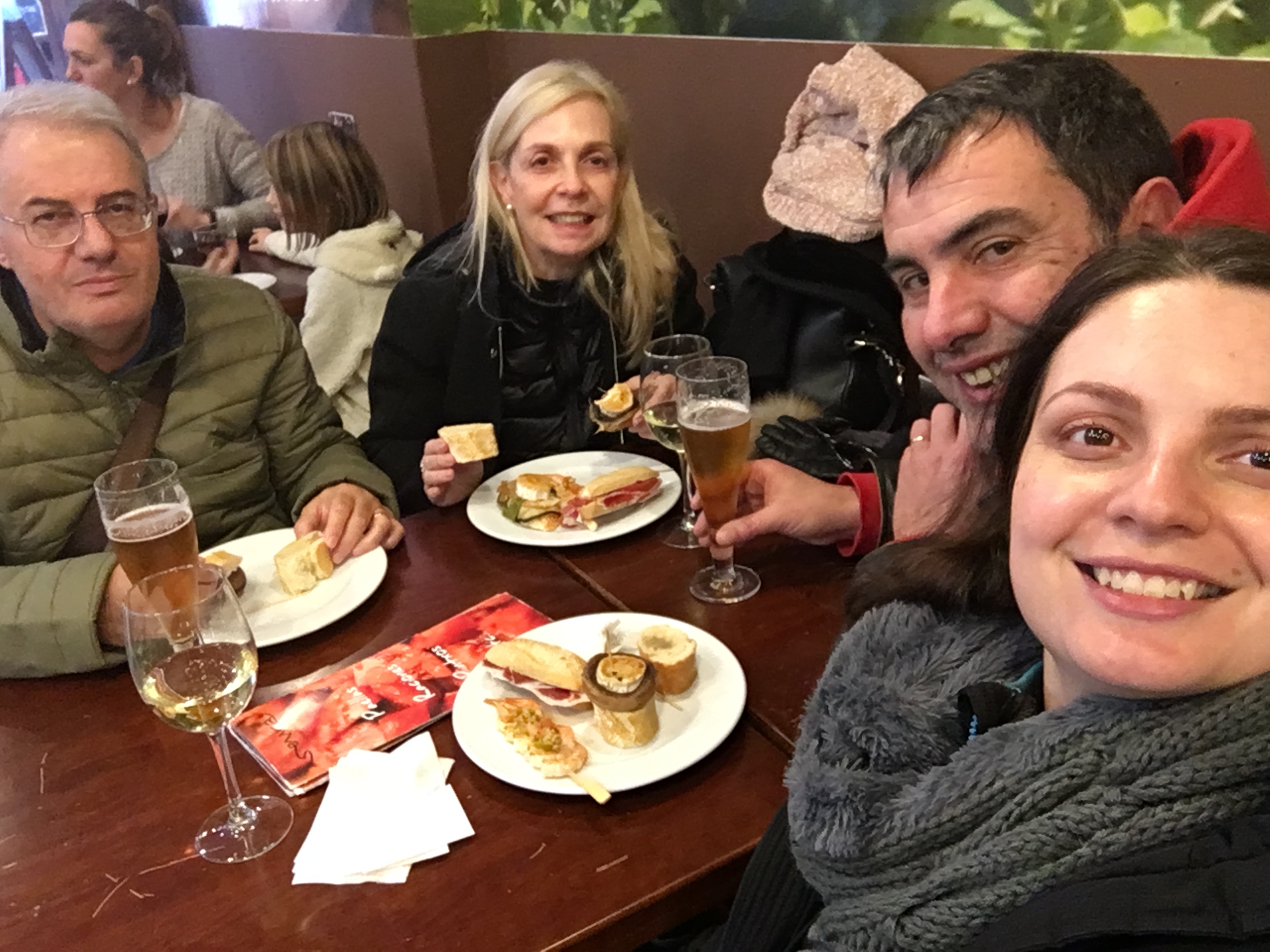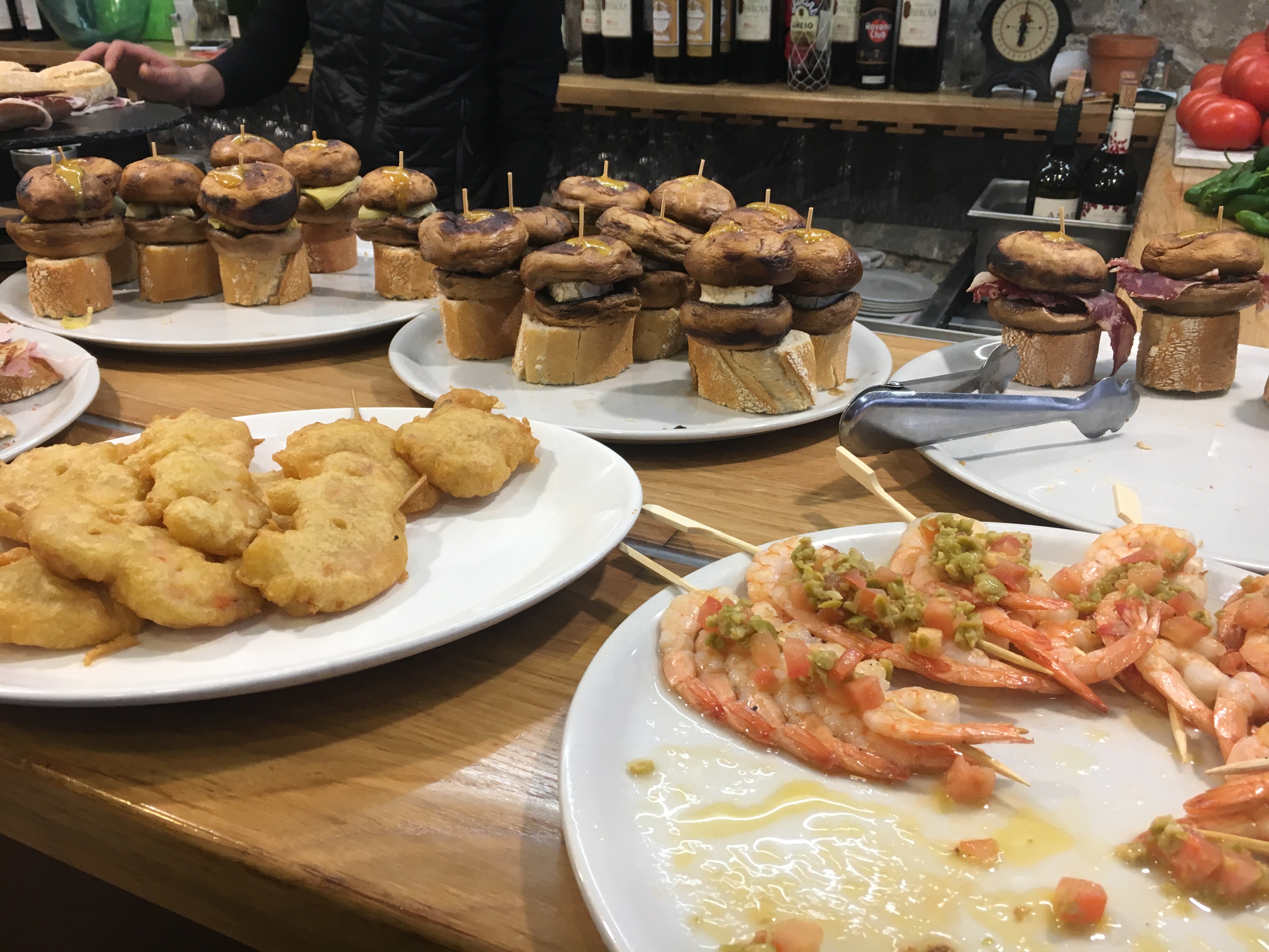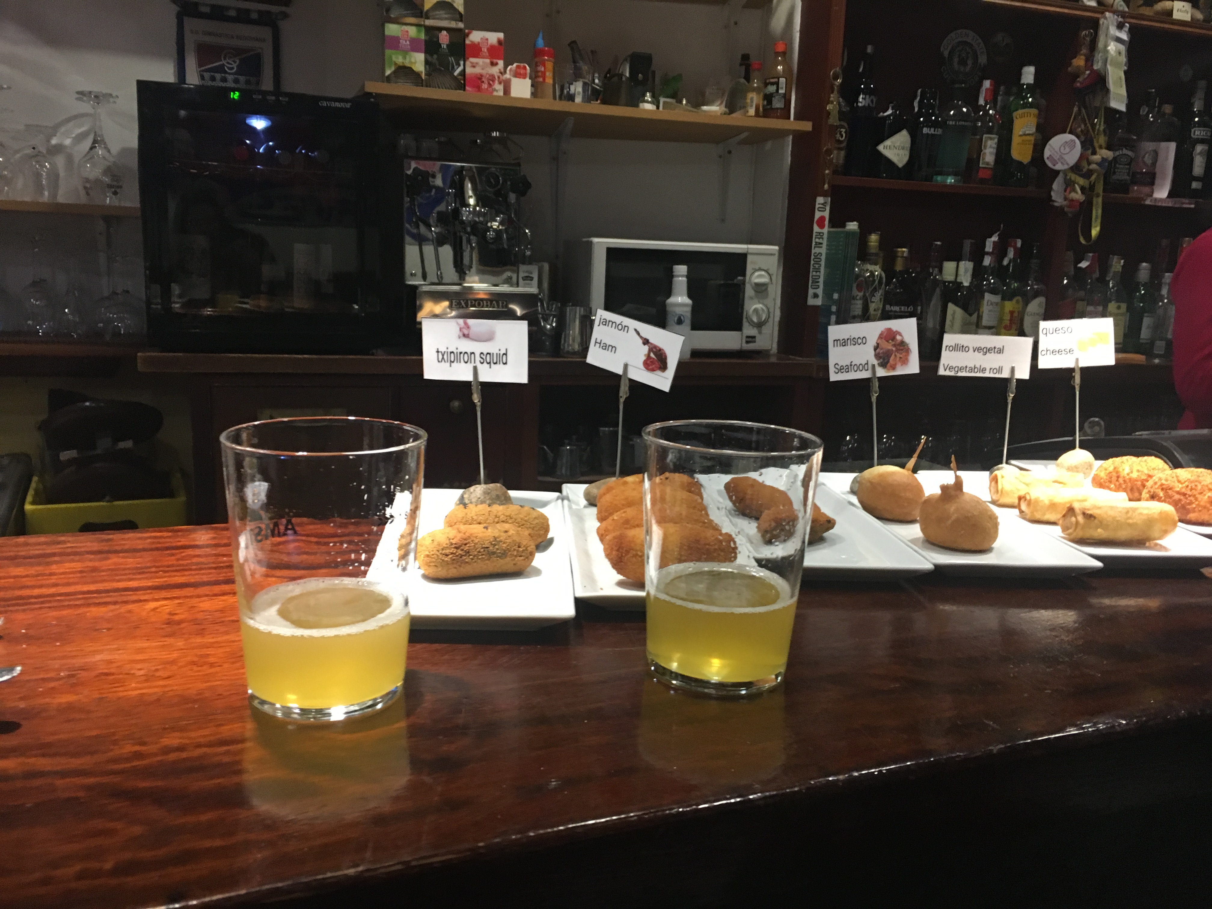 A parte velha da cidade tem uma densidade enorme de bares por metro cuadrado que nao sabíamos por qual começar. Optamos por ir entrando nos que havia mais gente dentro e olhávamos a barra onde ficam dispostos os diferentes pintxos que determinado bar oferece. Para acompanhar pedimos uma taça de vinho (txikito) e cerveja (zurito). Há pintxos para todos os gostos e bolsos, mas para nao errar, tenho um amigo que é de San Sebastian e me recomendou começar pela rua 31 de Agosto com o Gandarias Jatetxea (Calle 31 de Agosto, 23) e depois seguir para o Atari (Calle Mayor, 18) ou o Txepetxa (Calle Pescadería,5). Vale consultar essa guia aqui que vai sempre atualizando as novidades dos bares.