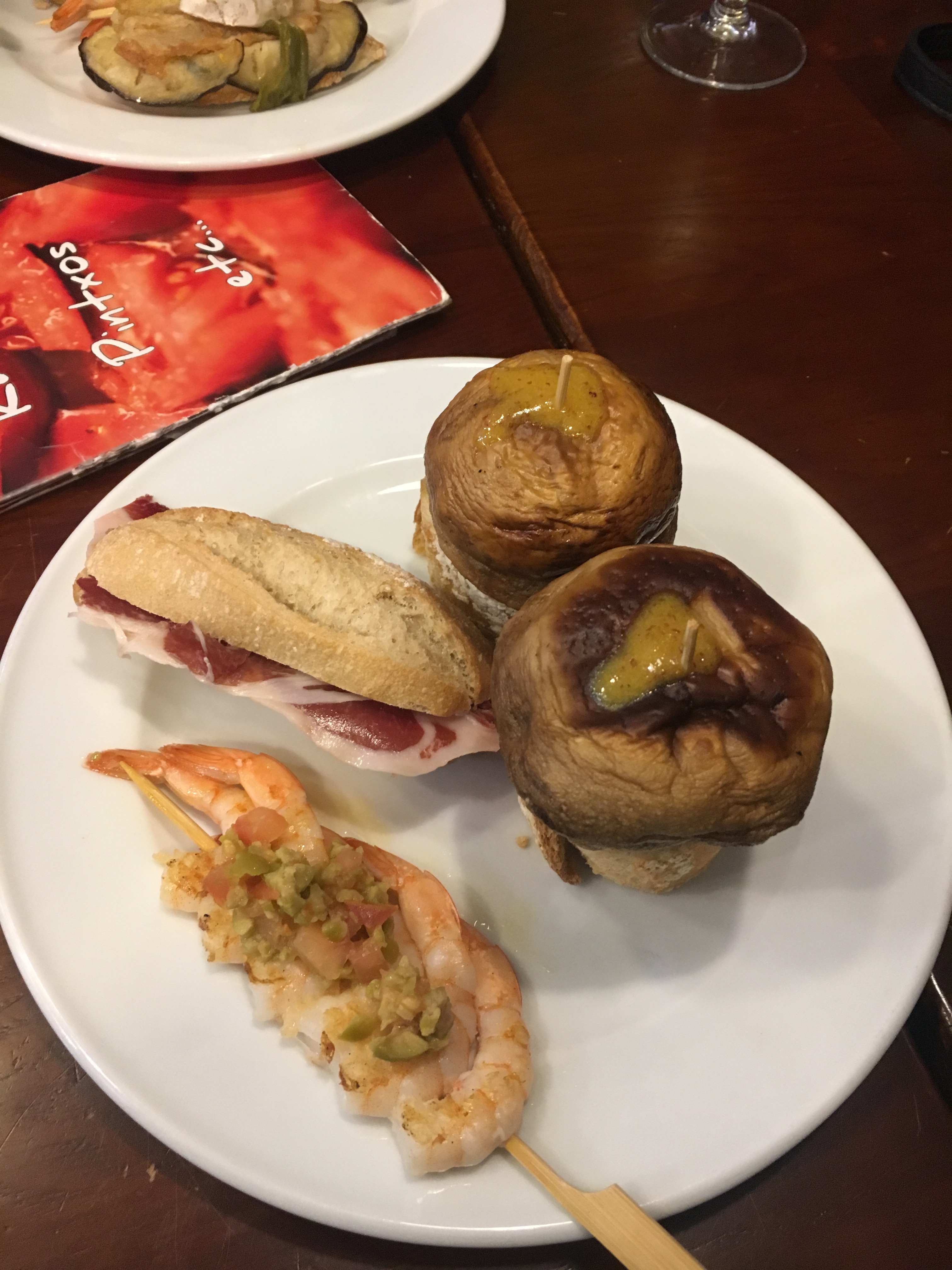 Na hora de comer, a pedida é “salir de pintxos”. Os pintxos sao fatias de pao sobre as quais sao colocadas pequenas porçoes de comida sustentadas por um palito que atravessa todo o conjunto.