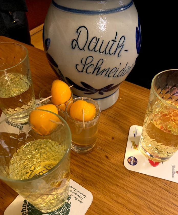 O drink é uma delícia, se chama Calvados mit Mispelchen, ou somente Mispelchen, tradicionalmente servidos nessas tavernas de Apfelwein, consitente em uma dose de conhaque de maça com uma Mispel (uma espécie de ameixa japonesa) perfurada por um palito dentro. A graça está em pegar a fruta pelo palito, brindar com ela, dar uma mordida e em seguida, dar um gole no conhaque. Uma delícia! Pedimos repeteco!