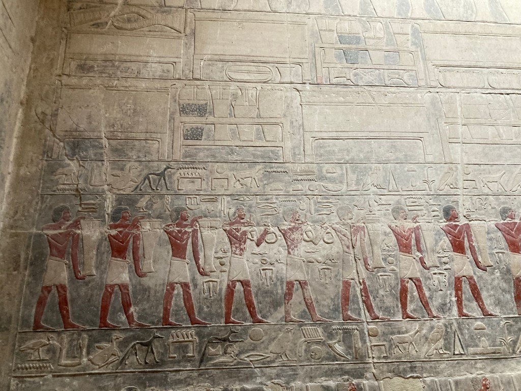 Teti foi considerado o primeiro faraó da VI Dinastia e sua pirâmide conta com 52m de altura e 78m de largura. No seu interior se vêem os primeiros “textos das pirâmides”, que segundo nosso guia, eram fórmulas mágicas que serviam para orientar o caminho das almas, uma espécie de oração, entendo.