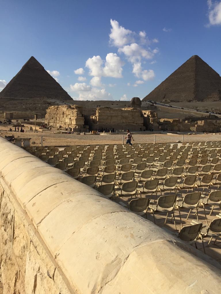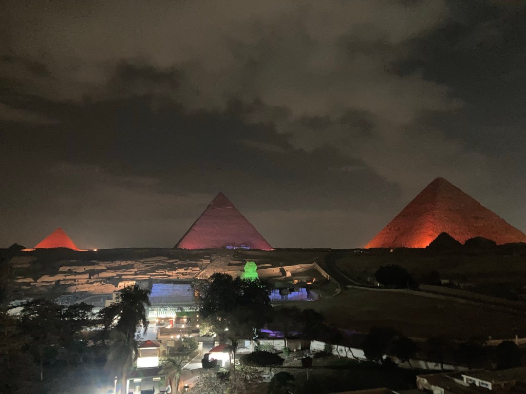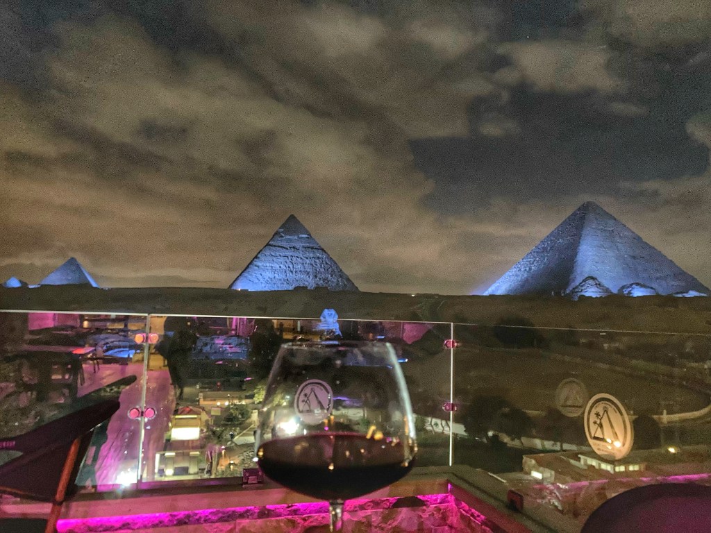 Como nosso hotel ficava de frente para as pirâmides foi bonito vê-las iluminadas do terraço do hotel enquanto jantávamos e tomávamos um vinho egípcio bem bom de uvas Bobal.