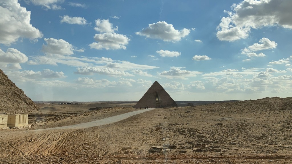 Junto à faixada da pirâmide, estão 3 pequenas pirâmides de uns 20m de altura que são as pirâmides das rainhas – as tumbas da esposa e irmãs de Queops.