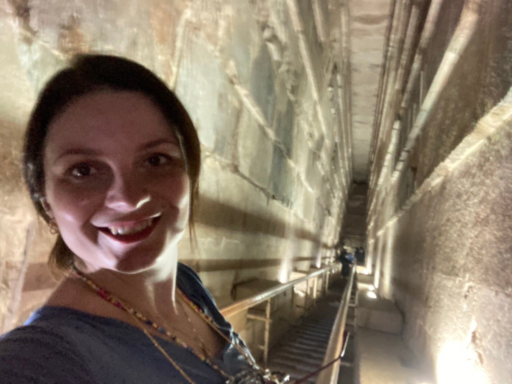 Primeiro subimos por uma escada rudimentar até a entrada da pirâmide – a entrada original ficava mais acima, mas hoje está fechada – a atual foi feita pelos saqueadores e é a usada até hoje. A partir daí, é necessário agachar-se e seguir por um túnel inclinado de 100 metros de comprimento e 30 cm de largura. De repente, surge um cruzamento do qual se extende um outro túnel agora mais confortável, de 1,30m de altura e 1 metro de largura, que sobe por mais 40 metros até chegar à Grande Galeria, um espaço de mais ou menos 50m de largura onde está a Câmara do Rei.
