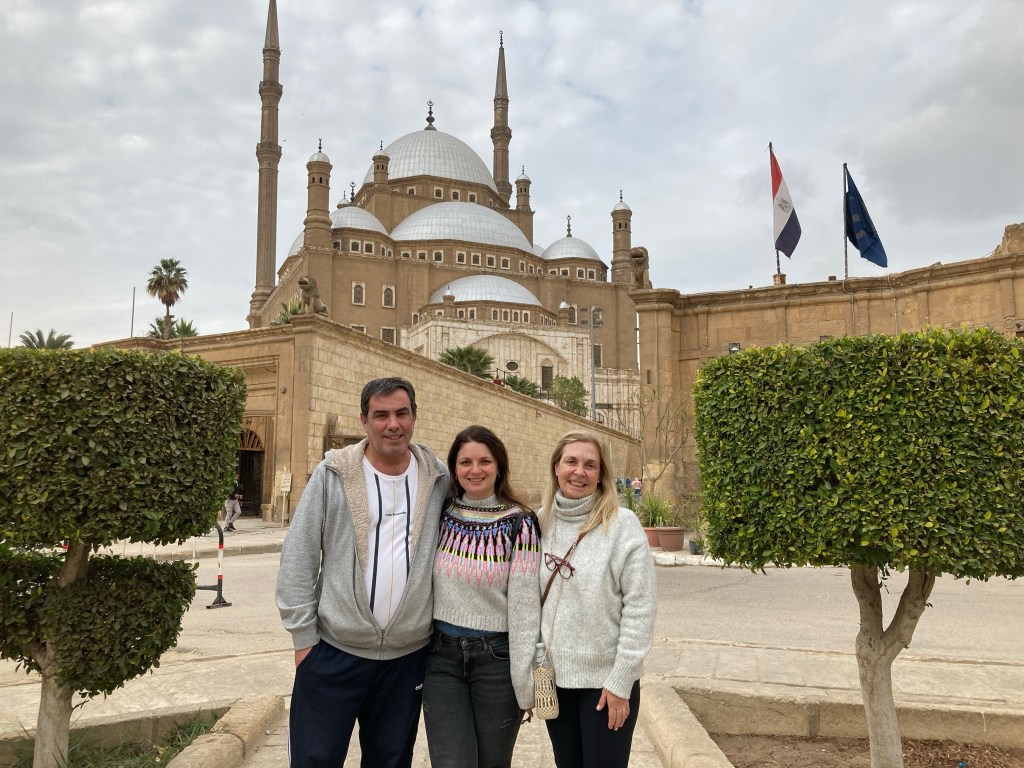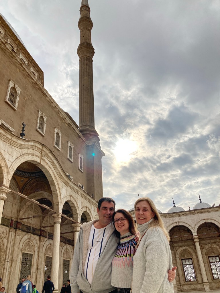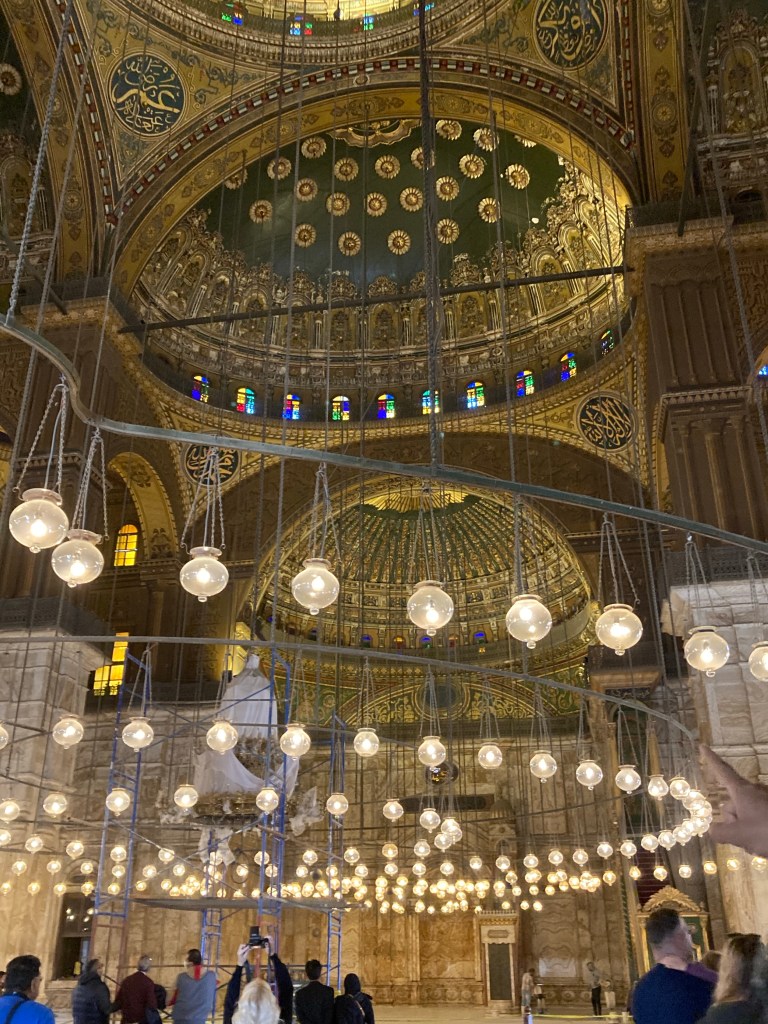 Nós visitamos a Mesquita de Mohamed Ali, que levou 18 anos para ser construída (1830-1848) toda em alabastro branco dentro da Ciudadela. Formada por linhas clássicas otomanas, com cúpula sobre cúpul, foi construída pelo mesmo arquiteto da Haya Sofia de Istambul, daí a sua grande semelhança.