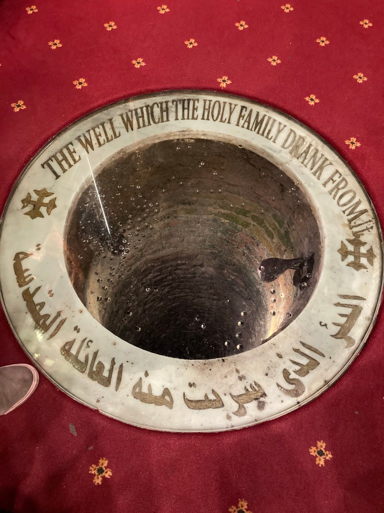 Para aceder à gruta da Sagrada Família, é preciso descer umas escadas do ldo esquerdo do altar, onde está o poço em que a Sagrada Família recolhia água e o bercinho de pedras de Jesus.