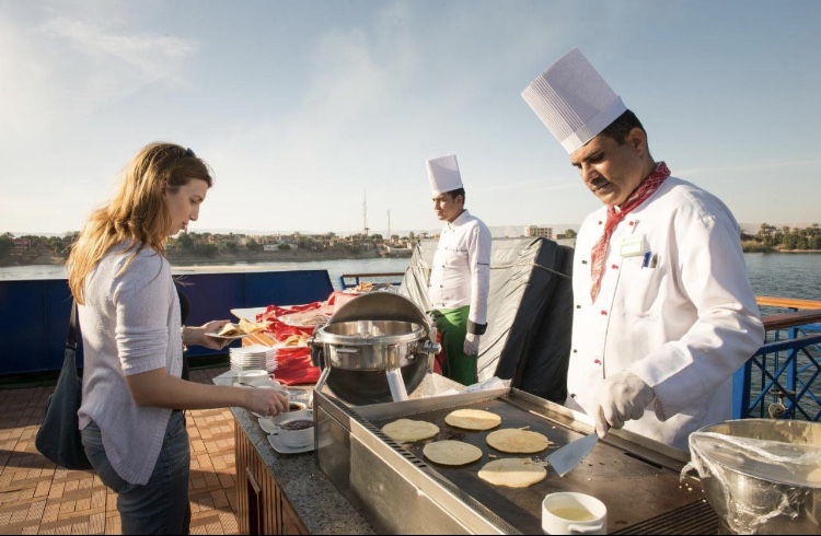 Também a parte são cobradas todas as bebidas como café, refrigerantes, água, cerveja e vinho. Os preços são iguais a um restaurante europeu, por exemplo, o café saia a 2,5€, a cerveja e a água a 5€ e uma garrafa de vinho tinto egípcio cerca de 20€. Uma dica é comprar vinho no Duty Free do aeroporto de Assuã assim que você desembarcar. É permitido comprar 1 garrafa por pessoa e eles fazem uma anotação sobre o visto no passaporte porque no Egito o álcool é artigo controlado já que a religião muçulmana não permite o seu consumo. Conversamos com o guia e ele disse que essa anotação é normal e realmente não tivemos nenhum problema. Compramos vinho francês Bordeaux por 15U$ cada garrafa.