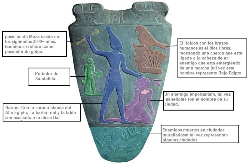 No átrio do museu também está a Paleta de Narmer (Mena), o primeiro imperador da Dinastia I, mostrando-o com as duas coroas, do baixo e alto Egito, representando a unificação dos reinos e marco do ponto de partida de mais de 3000 anos de história faraônica, que contou com mais de 170 governantes e 30 dinastias. Estas paletas eram usadas para macerar perfumes ou maquiagens em rituais e cerimônias. Esta especificamente foi encontrada no templo de Horus, o deus falcão, perto de Edfu.