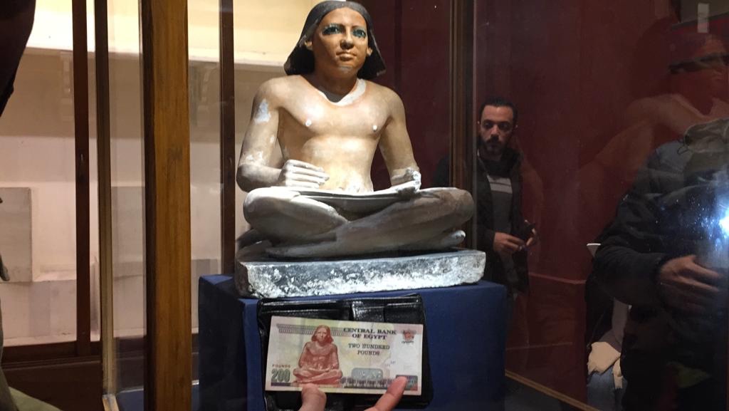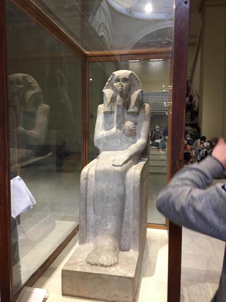 Também se destaca o Escriba Sentado, da Dinastia V, uma figura esculpida em pedra calcária com as maos a postos para tomar um ditado. Os olhos de vidro encrustrados lhe conferem um grande realismo e a peruca atras das orelhas significa atenção para escutar.
