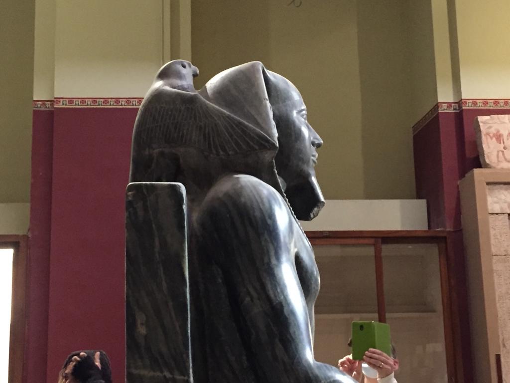 Dentre as obras do Império Antigo se destacam a estátua do faraó Quefren, o construtor da segunda pirâmide, cujo rosto está representado na Esfinge e que foi encontrada pelo arqueólogo francês Antoine Mariette em 1860 em uma das escavaçoes em Gizé. O faraó está representado com um falcão atrás da cabeça, símbolo do deus Horus, com as asas abertas em sinal de proteção.