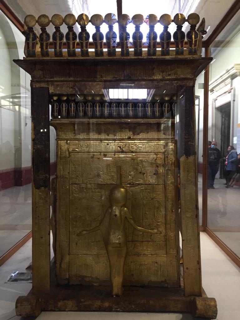 Um pouco mais para frente estão quatro sepulcros enormes de madeira dourada, um dentro do outro, como matrioska russa, que continha o sarcófago de ouro do faraó dentro.