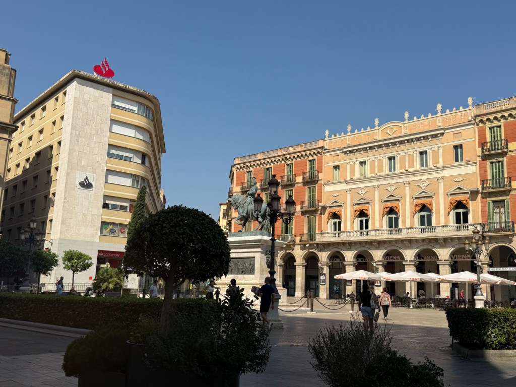 Cheguei então à Plaça Prim, uma das mais fotogênicas da cidade, com suas palmeiras simétricas e o monumento ao General Prim bem no centro. A praça tem um ar solene e elegante, ideal para uma pausa estratégica no banco mais bonito que encontrar. O clima ali é de tranquilidade urbana, com um toque de grandiosidade.