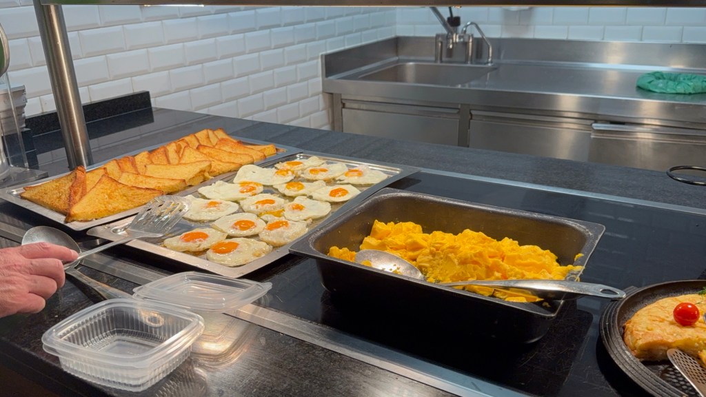 Mas o que me conquistou mesmo foi o café da manhã: além dos clássicos ovos mexidos, pães, cereais e frutas, havia estação de panquecas, churros com chocolate, embutidos espanhóis e… espumante!