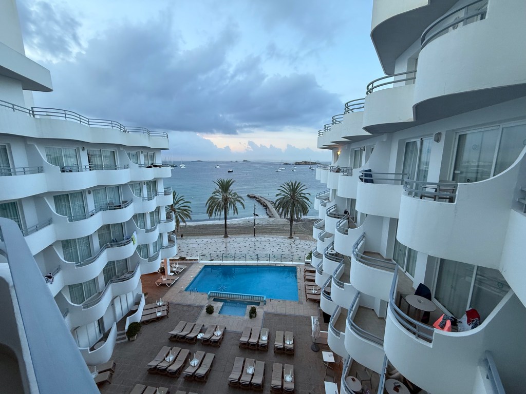 Nos hospedamos no Apartamentos Mar y Playa, em Figueretes, uma escolha excelente para quem quer estar perto do centro de Ibiza Town sem perder o conforto. Também queríamos estar perto da area de restaurantes e baladas, mas longe o suficiente para ter um ambiente tranquilo. O apart-hotel tem recepção 24h, piscina, beach club e um restaurante chamado Horizons, que logo virou um dos nossos favoritos. Além de servir drinks bem preparados e pratos saborosos a preços justos, oferece vista direta para o mar — perfeito para começar a sentir o clima da ilha.