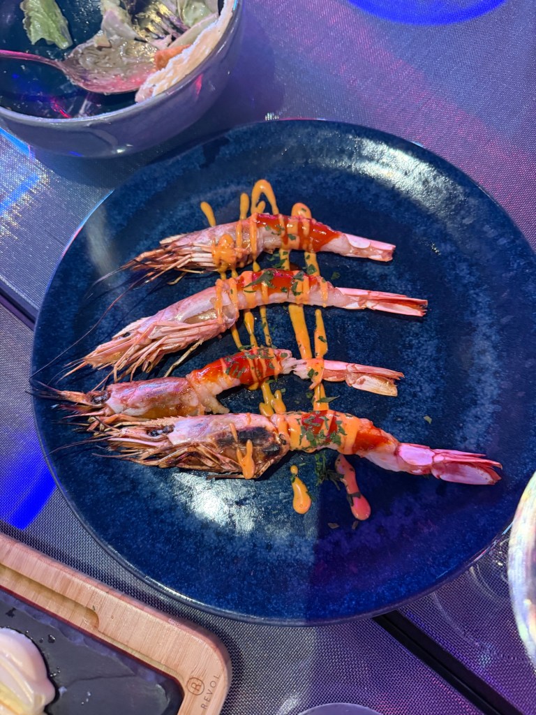 À noite, fomos jantar no Mariner, em Ibiza Town, um dos melhores restaurantes que já conhecemos em viagens. A cozinha é criativa, sem perder a essência mediterrânea. O destaque foi o polvo grelhado, servido com batatas fritas no bacon — uma combinação ousada e absolutamente viciante. Também provamos a raia, peixe típico da região, preparada de forma delicada e deliciosa. O serviço atencioso e a vista para o porto completaram uma experiência gastronômica memorável, que elevou ainda mais o início da nossa estadia.