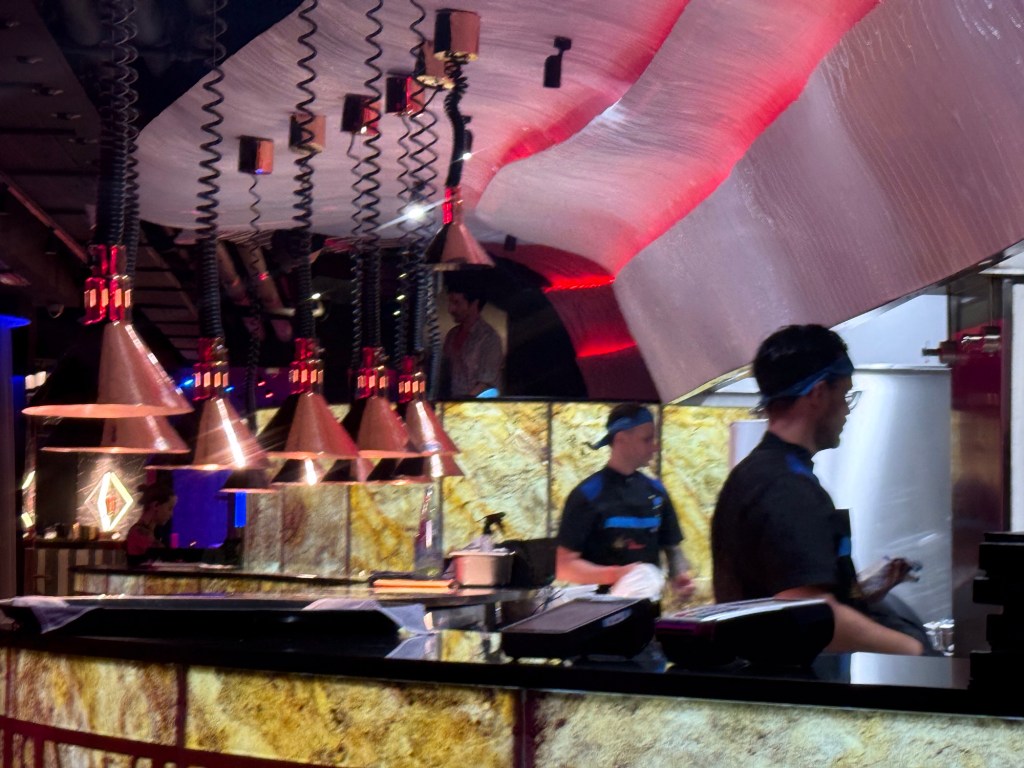 O restaurante Hells’s Kitchen oferece o pacote “Party & Bite”, que precisa ser reservado por telefone. A experiência começa com um menu fechado em um ambiente moderno e divertido, inspirado no programa de mesmo nome do chef Gordon Ramsay, mas com um toque sofisticado e teatral. Até o corredor para o banheiro, iluminado de forma cênica, é inusitado e parte do espetáculo.