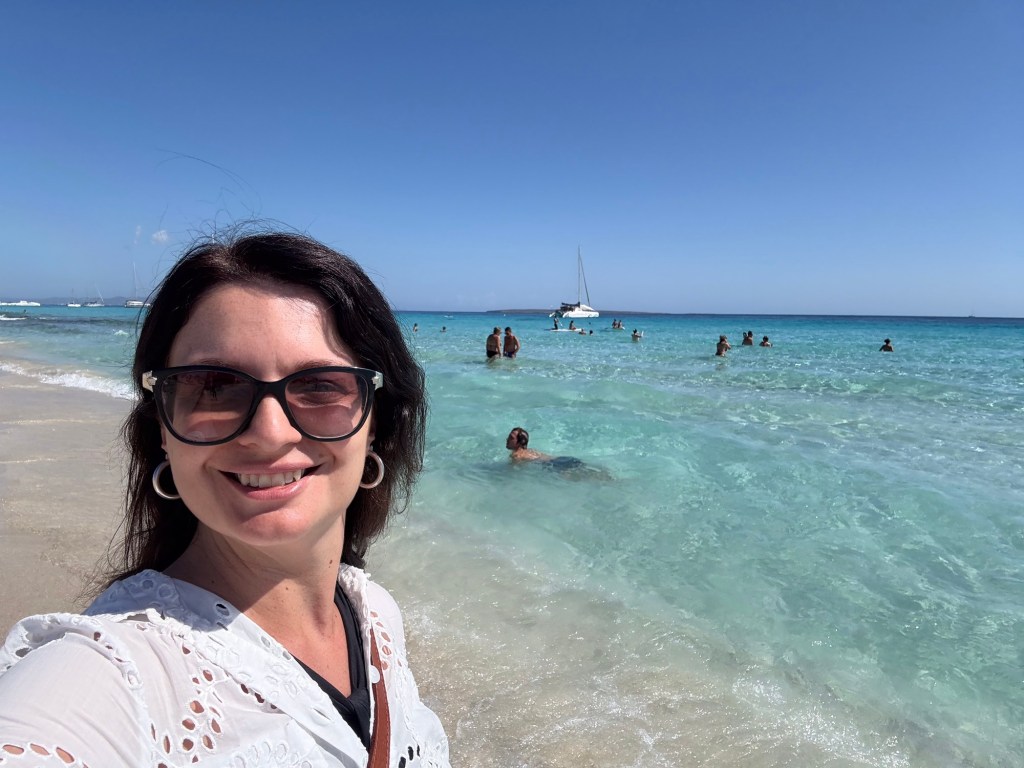Uma vez ali, depois de visitar a praia, tomamos mais um Aperol Spritz no Es Ministre – estava fazendo 40 graus nesse dia – e entendemos por que ela figura sempre entre as mais bonitas do mundo. Com sua transparência absoluta, a água se mistura à areia fina e branca, revelando um brilho verde-água único. Outro restaurante popular por ali é o Juan y Andrea e fica na outra ponta da praia.