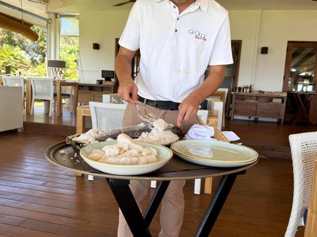Almoçamos no incrível Gecko Beach Club, onde a gastronomia mediterrânea encontra o ambiente boho-chic típico de Formentera. Comemos um robalo no sal que estava delicioso. O Gecko também é um hotel e tem uma lojinha de saídas de banho bem diferentes. Comprei, claro.