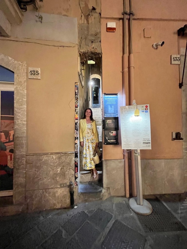 No meio das ruelas de Taormina, descobri o Vicolo Stretto, considerado a rua mais estreita da Sicília. Com apenas 43 centímetros de largura em seu ponto mais apertado, é uma escadaria que parece mais um segredo escondido entre as paredes coloridas e adornadas por vasos de flores.