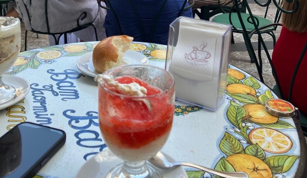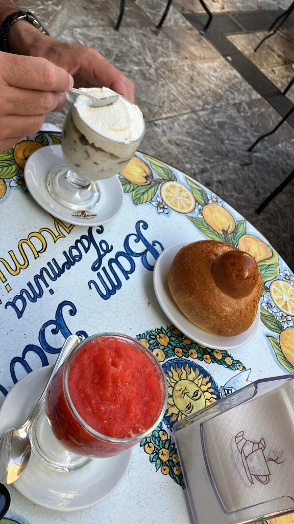 No meio do passeio, fizemos algumas paradas inesquecíveis: saboreamos uma granita no Bam Bar, que é quase uma instituição em Taormina.