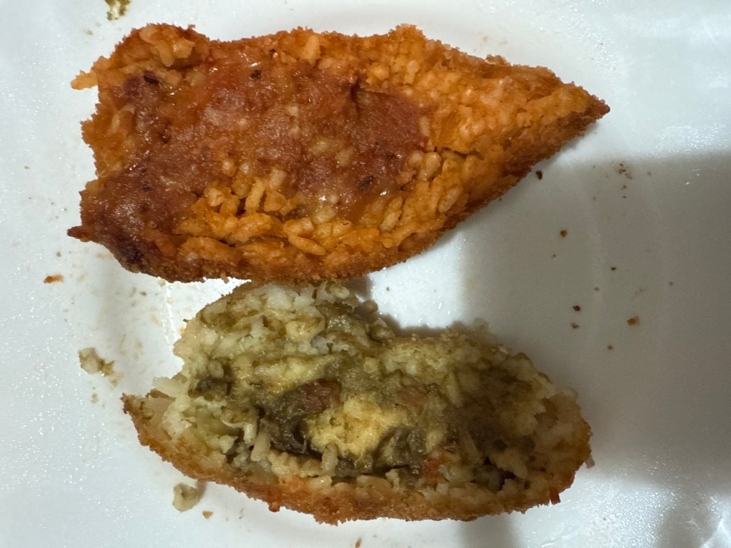 Entre as delícias de rua, experimentei os arancini, bolinhos de arroz dourados que nasceram no período árabe, inspirados nos pratos de arroz temperados com açafrão, e que em Palermo são arredondados enquanto em Catânia lembram o formato do Etna (é o formato da nossa coxinha); recheados com ragù ou pistache, revelam a criatividade da ilha.
