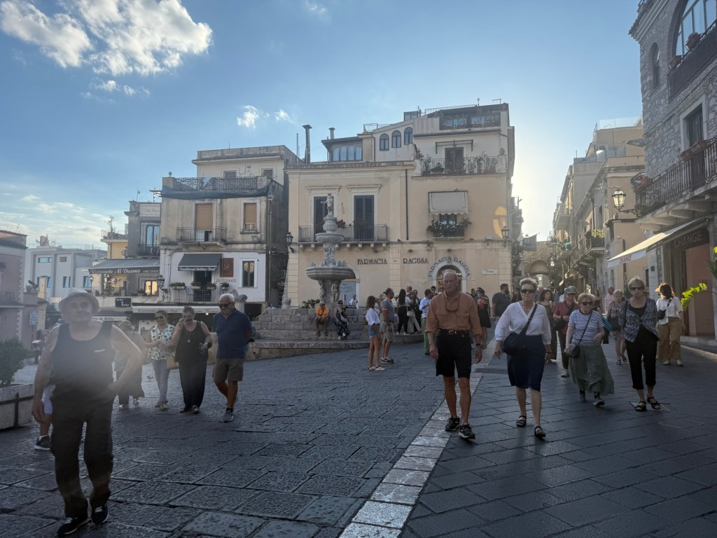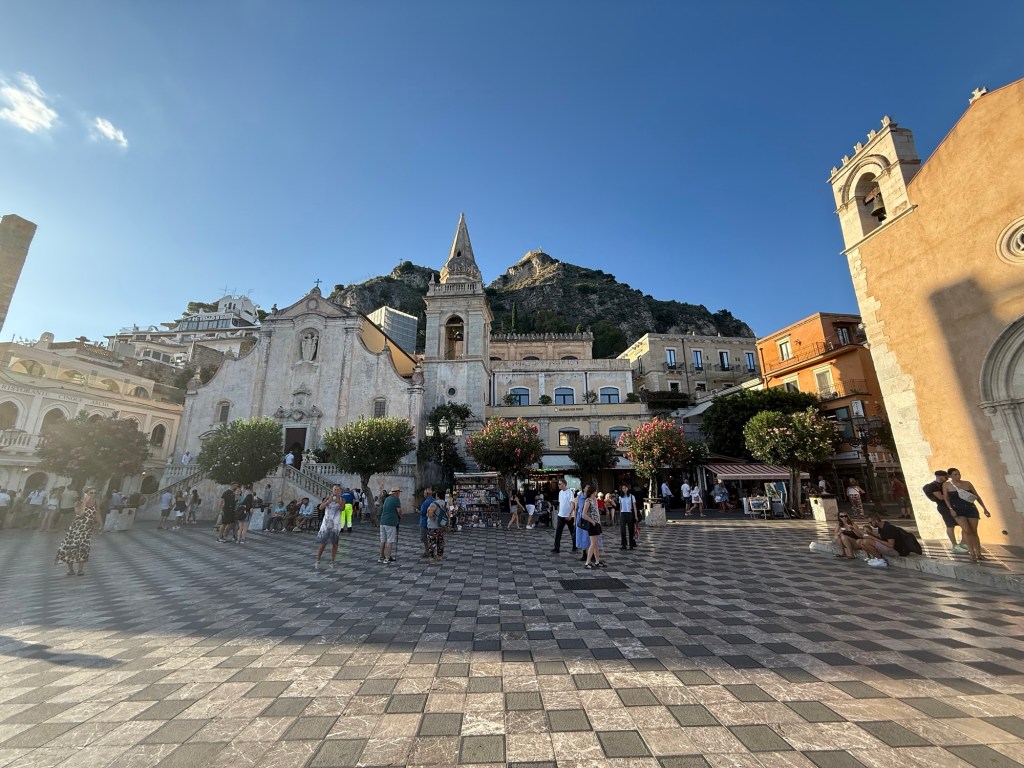 Seguindo pela rua principal, cheguei à Piazza IX Aprile, o coração pulsante da cidade. O chão quadriculado em preto e branco parecia um tapete que conduzia meu olhar até o Etna ao fundo e a baía cintilante.