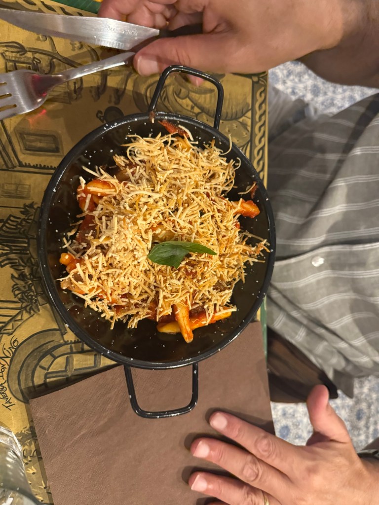 Provei a clássica pasta alla Norma, criada no século XIX em Catânia como homenagem à ópera Norma de Vincenzo Bellini: um prato que une ingredientes árabes, como a berinjela, à ricotta salata local, resultando em uma verdadeira obra-prima catanesa. Também me rendi à pasta al pistacchio, símbolo de sofisticação, feita com o pistache de Bronte — o “ouro verde” trazido pelos árabes e que encontrou no solo vulcânico do Etna seu sabor único.