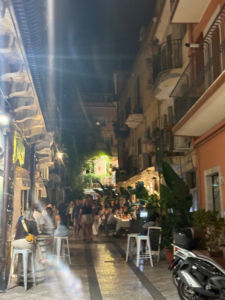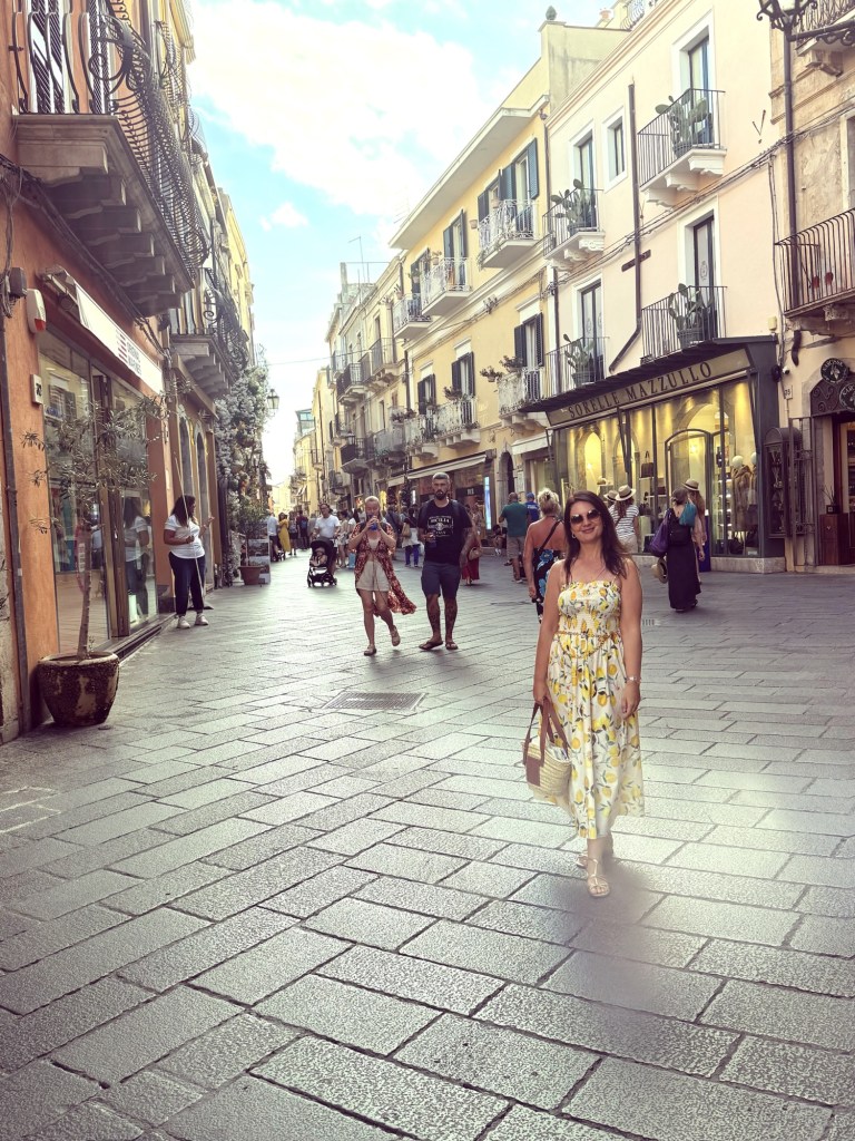 Entrei no centro histórico de Taormina pela Porta Messina, uma das antigas portas da muralha medieval. Logo na chegada, o Corso Umberto I já esbanja todo seu charme: palacetes em pedra, lojinhas cheias de cores, boutiques elegantes e trattorias que exalam aromas irresistíveis.