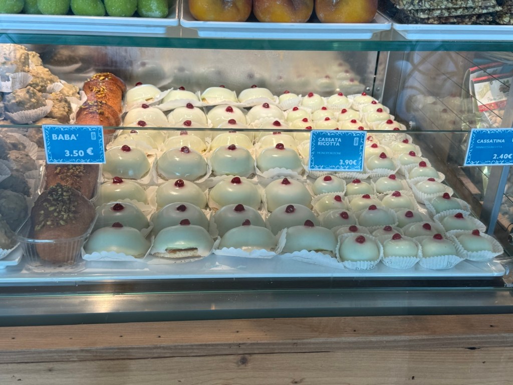 Na Sicília, até os doces contam histórias de conquistas e encontros de culturas. A cassata, nascida no período árabe com ricotta adoçada e marzipã de amêndoas, tonalizado em verde, ganhou forma nos conventos normandos e, no barroco, se transformou em um espetáculo colorido com frutas cristalizadas e glacê. Sua versão em miniatura, a cassatina, é como uma joia doce. Eu conhecia a versao da Di Cunto, em Sao Paulo, mas esta tem um gosto de licor bem forte, enquanto que a versao italiana troca o licor pela cobertura de marzipa.