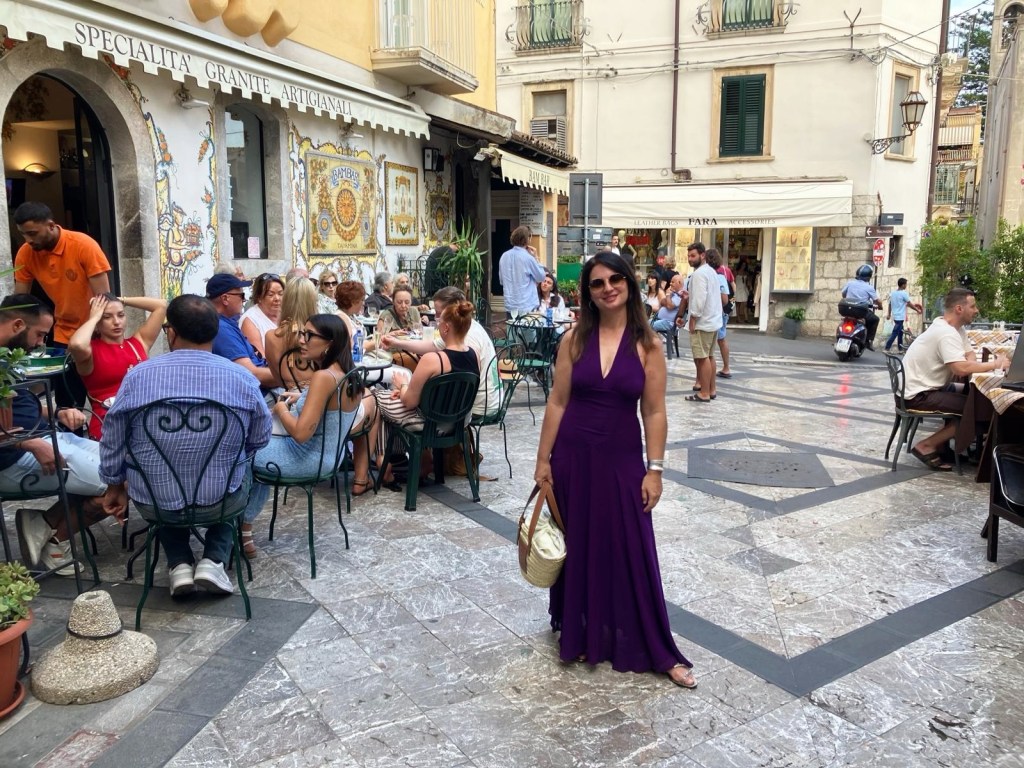 Caminhar pelo centro histórico: Corso Umberto, lojinhas, ruazinhas floridas. Parada na Piazza IX Aprile para vistas incríveis do mar e do Etna e provar a granita no Bam Bar. À noite: jantar no Bar Timeo no Grand Hotel Belmond Timeo e visita ao Teatro Antico di Taormina para assistir uma ópera (no meu caso, a Carmen).