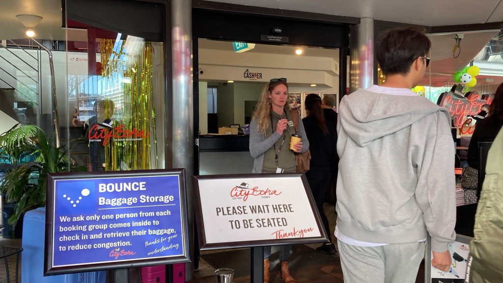Ao final do dia, pegamos novamente o ferry de volta ao Circular Quay, com o sol se pondo sobre a Harbour Bridge e a Opera House dourada pela luz do entardecer. Dali seguimos até o Rydges World Square Hotel, onde estávamos hospedados. O hotel fica em uma área vibrante, repleta de restaurantes, bares e lojas, com uma avenida movimentada logo à frente — é ali também que fica o Cupra Café.